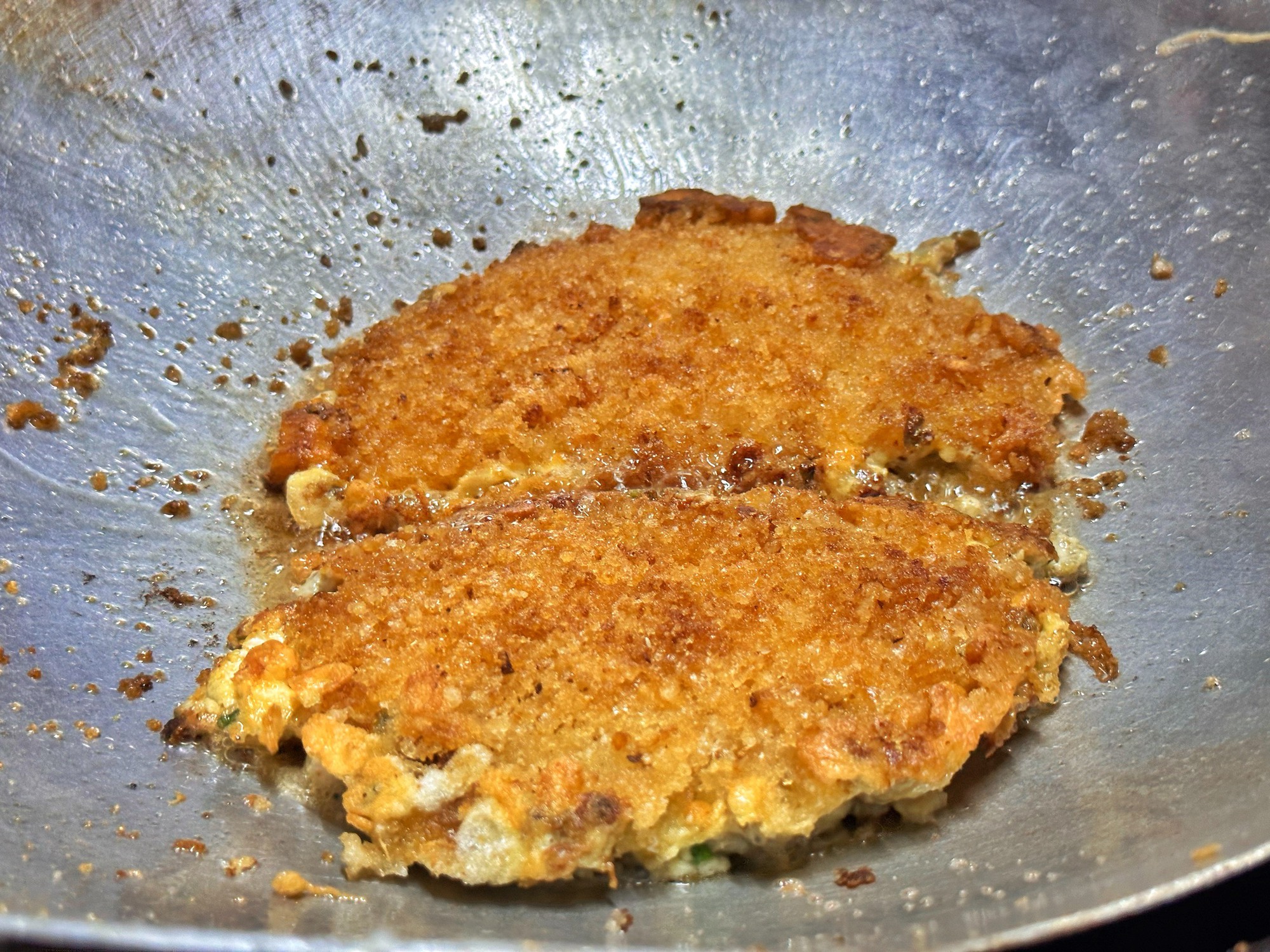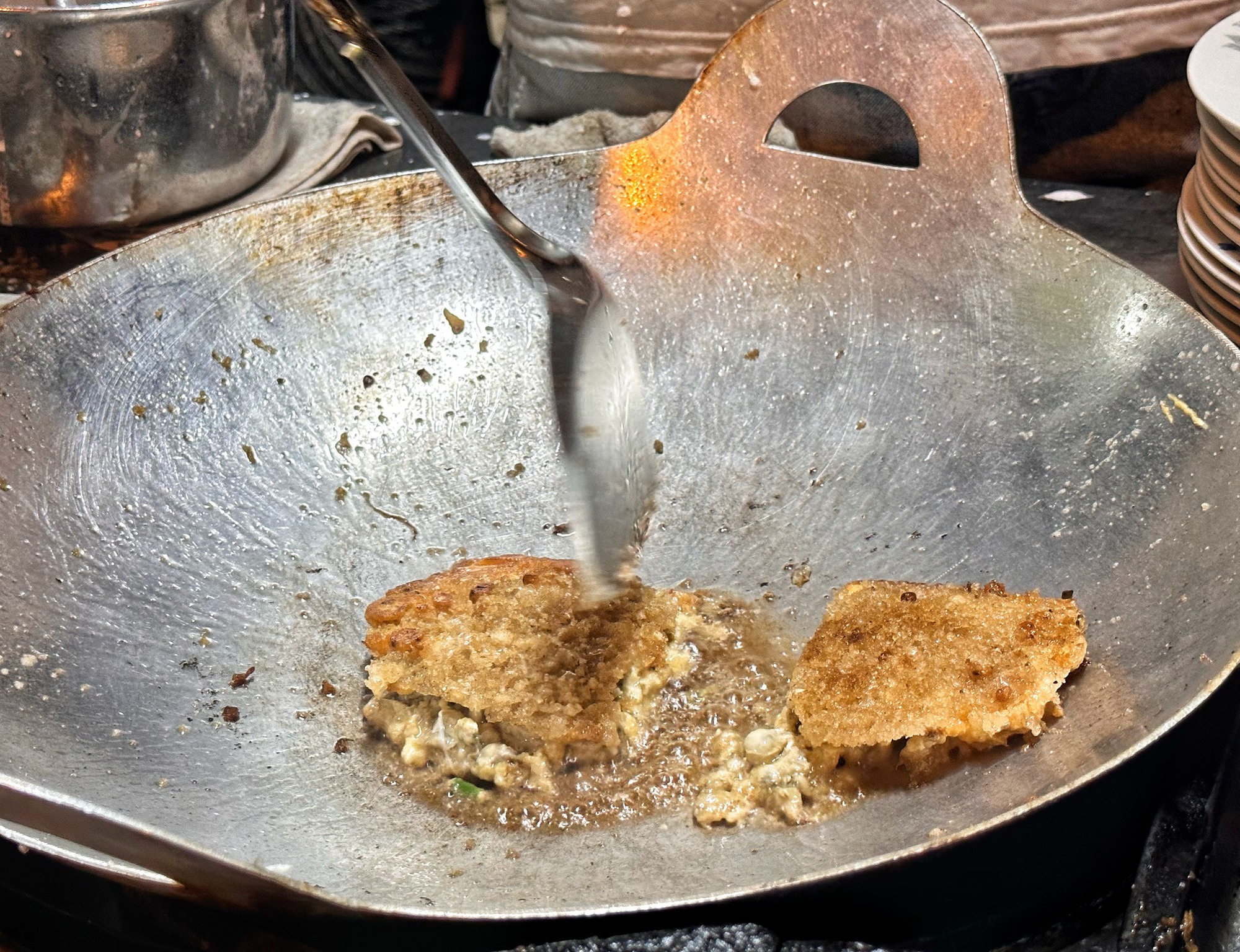 Chờ một lúc khi rế bột đã cứng, hỗn hợp trứng hàu được đổ lên trên. Ông Cường liên tục đảo để tất cả kết dính vào nhau. Một thoáng, miếng hàu chiên vàng giòn rụm được trút ra đĩa, trang trí bằng rau xà lách và ngò lên trên.