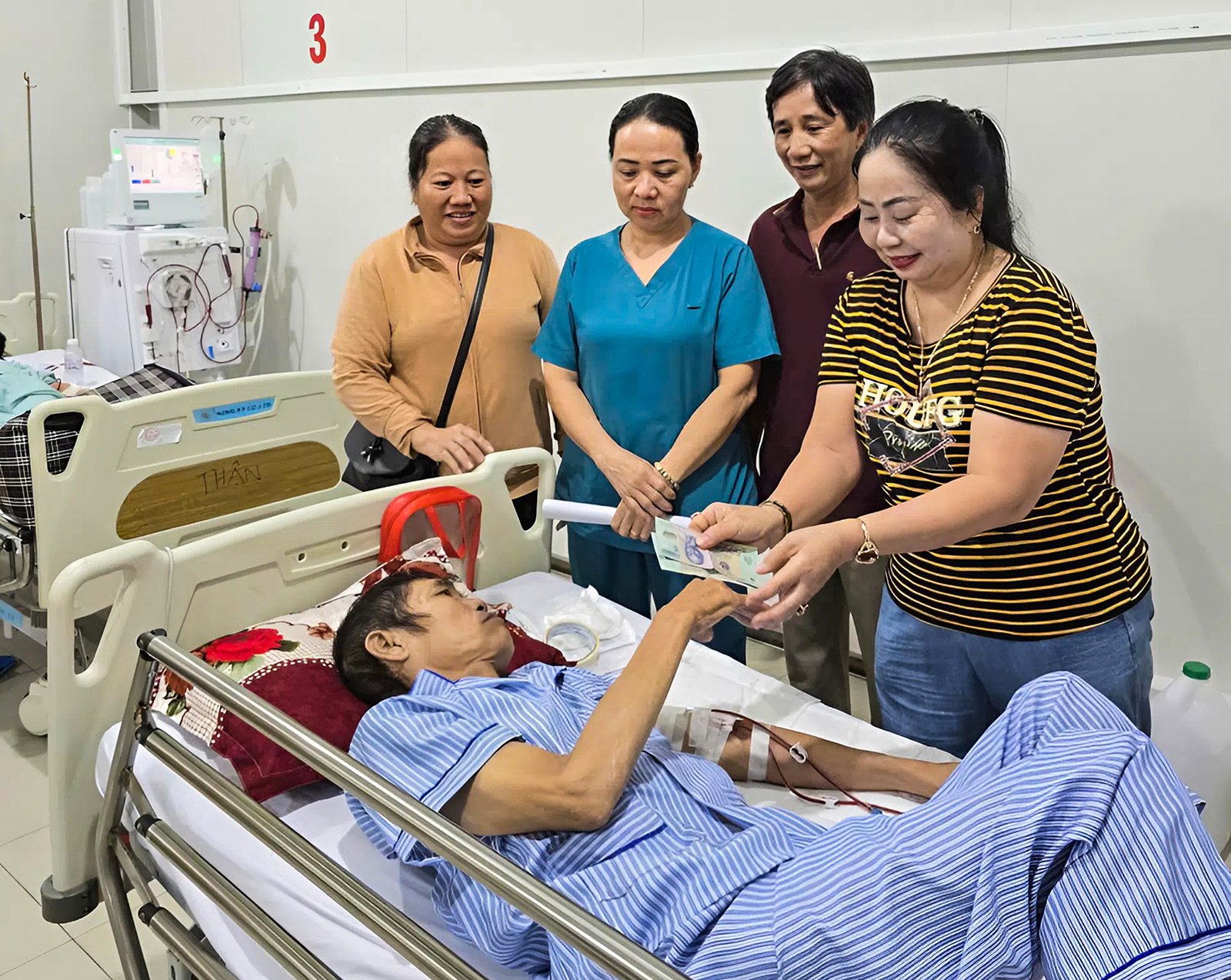 السيدة هوينه ثي جاي هانه، المقيمة في حي راش هام، بمنطقة فو كوك الخاصة، تخضع لغسيل الكلى ثلاث مرات أسبوعيًا. عائلتها الفقيرة أصلًا أصبحت الآن أكثر بؤسًا. وجهها داكن ومتعب لأن موعد غسيل الكلى قد اقترب. كانت السيدة هانه متأثرة: "لو لم أتلقَّ الدعم المالي، لما تمكنت على الأرجح من الصمود حتى الآن". تخضع السيدة هانه لغسيل الكلى منذ أكثر من عام، وقد ضعفت صحتها بسبب المرض. لديها تاريخ من مرض السكري وارتفاع ضغط الدم والفشل الكلوي منذ عام ٢٠٢٤. عائلتها فقيرة. ابنتها أيضًا خضعت لغسيل الكلى من قبل لكنها توفيت. هي حاليًا مريضة، لكنها تعتني بحفيدين صغيرين. حياة السيدة هانه صراع يومي، ولكن بفضل حب الناس لها، أصبحت أقوى.
