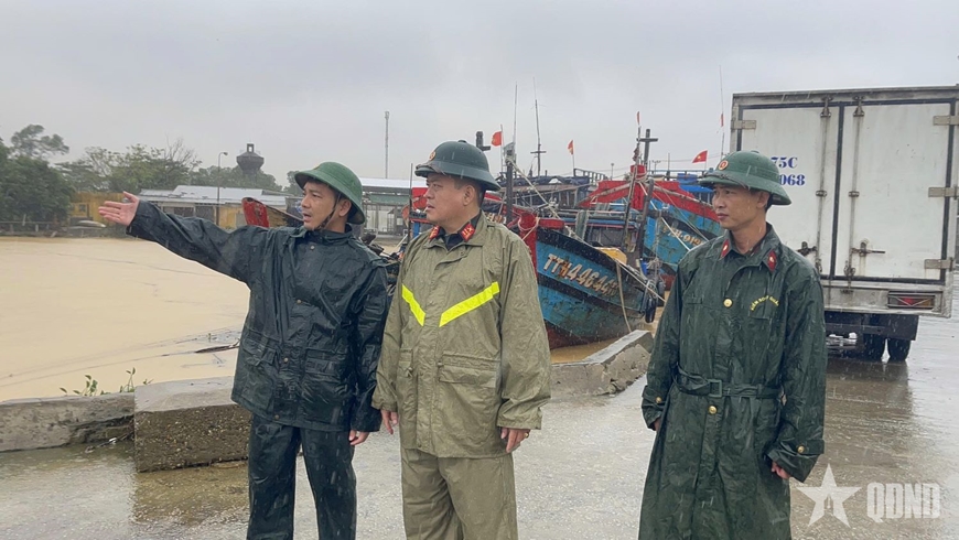 | قيادة مدينة هوي العسكرية تتفقد أعمال الاستجابة للعاصفة رقم 13 في منطقة سد ثوان آن البحري. |