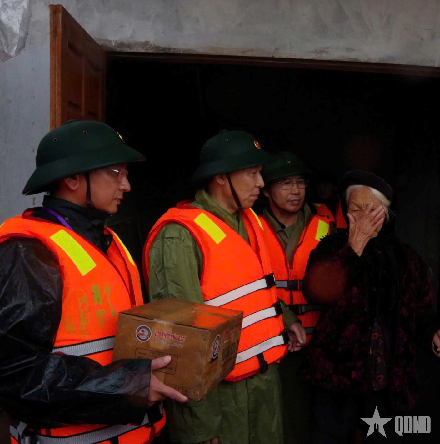 | قام العقيد فو كوانج ثين، المفوض السياسي للقيادة العسكرية لمقاطعة ها تينه، بزيارة المنازل في المناطق التي غمرتها الفيضانات. |