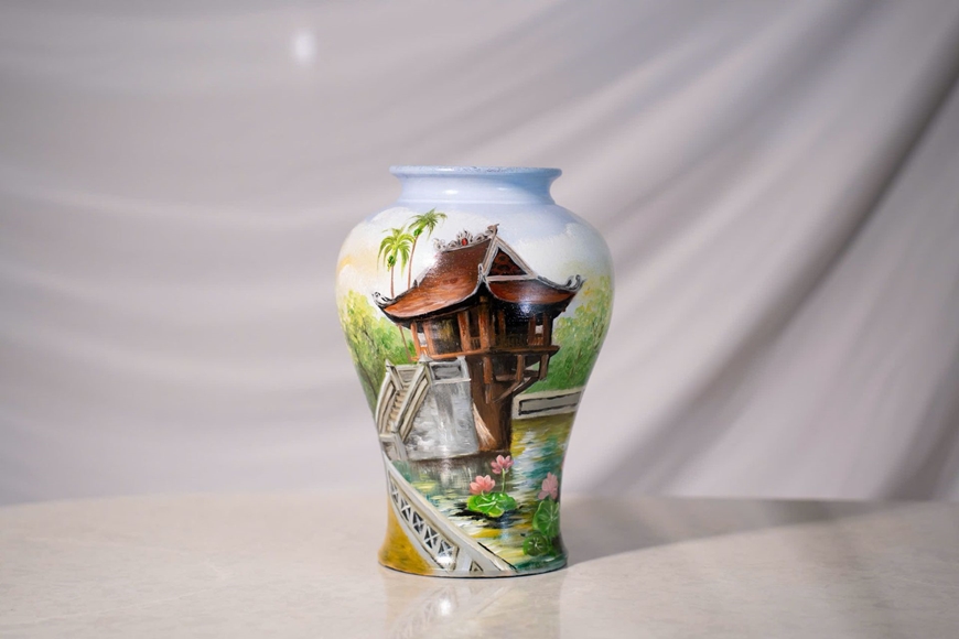 المادة الأساسية للمنتج هي الطين. أما الرسومات على المزهرية، فتُنفذ في الغالب باستخدام طلاء الأكريليك، ثم تُغطى بطبقة نهائية لإتمام السطح. لكن الأهم ليس المادة فحسب، بل مهارة الحرفي أيضًا. ولأنها كانت تجربتهم الأولى في العمل على منتج خزفي يصور معلمًا تاريخيًا، فقد استعان الفريق بحرفيين من قرية بات ترانغ للخزف للتعلم والتعاون. قام هؤلاء الحرفيون ذوو الخبرة، بناءً على تصميم الفريق، بتحويله إلى رسومات تفصيلية على جسم المزهرية. وقد شكّل مزيج الأفكار الشابة والحرفية الماهرة أحد العناصر الأساسية في تحويل المنتج من مجرد فكرة إلى واقع ملموس.