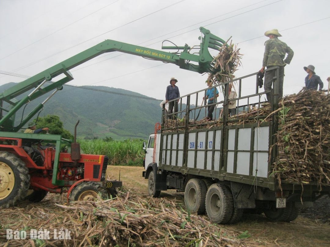 عند إنتاج قصب السكر ضمن سلسلة، لا يقتصر الأمر على الشراء فحسب، بل يُدعم مزارعو قصب السكر أيضًا بآلات حصاد قصب السكر. (في الصورة: حصاد قصب السكر باستخدام الآلات في بلدية سون هوا). |