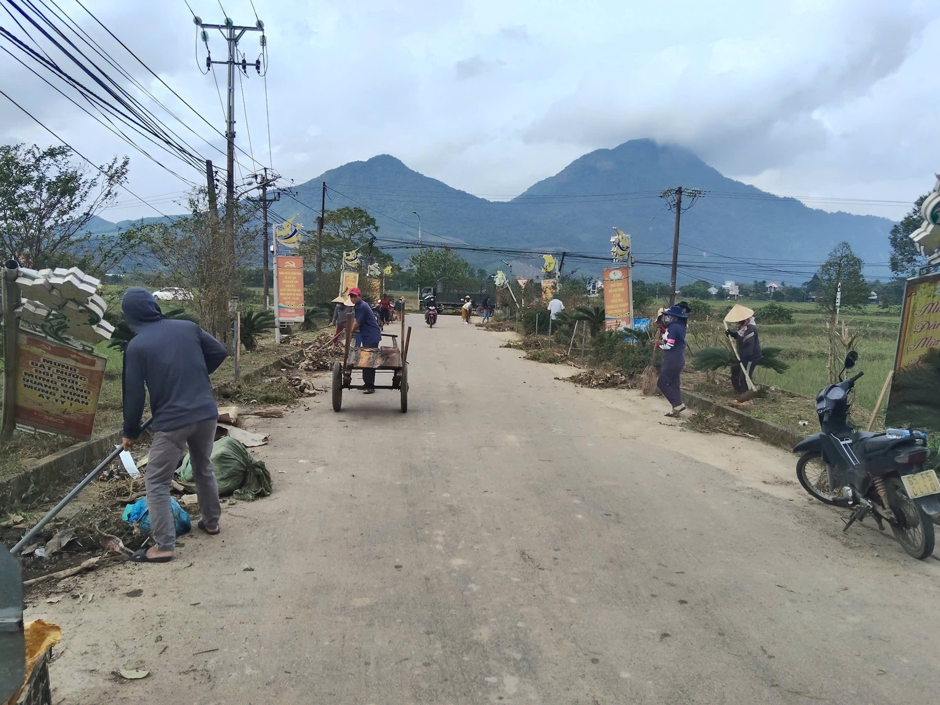 في قرية لوك ترونغ، فور انحسار المياه، أطلقت لجنة العمل الميداني حملة تنظيف شاملة للقرية. ساد جوٌّ من النشاط والحيوية: الناس يحملون المكانس، ويجرفون التربة، وعربات اليد، والعربات الصغيرة، والشاحنات تتناوب على نقل الطين والقمامة. في غضون ساعة تقريبًا، تم تنظيف الطريق المؤدي إلى القرية الثانية، والمنطقة الواقعة خلف المركز الطبي، وأراضي البيت الثقافي، وبوابة القرية.