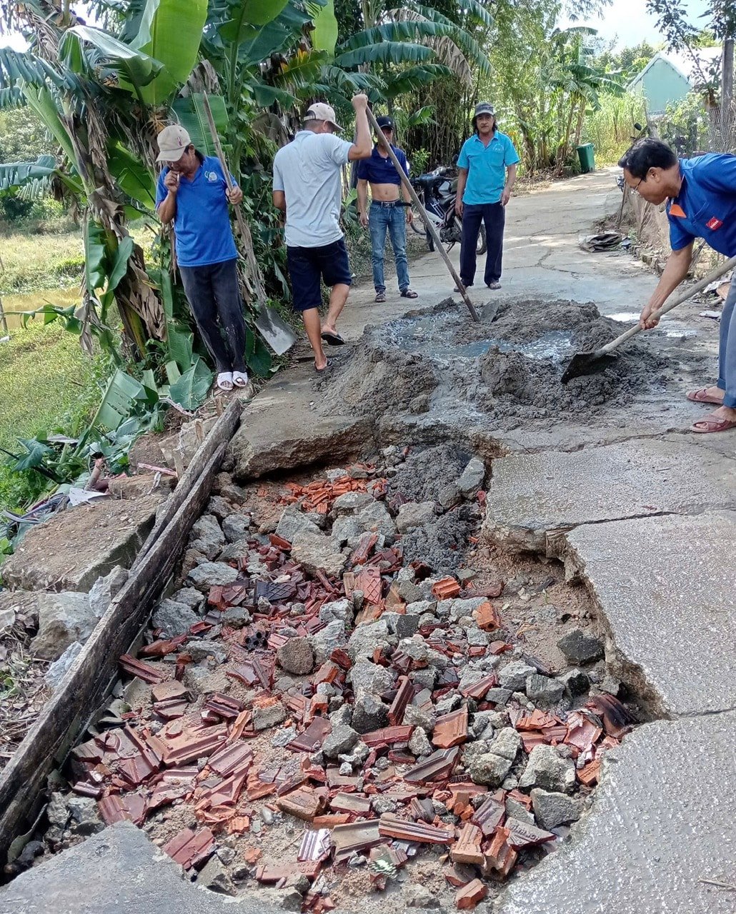 على الطريق في قرية 2، حيث تم كسر جزء من الخرسانة بسبب تدفق المياه القوي، لم ينتظر الناس الدعم بل ساهموا طواعية بنحو 10 ملايين دونج لشراء الرمل والحجر والأسمنت لإصلاح الطريق.