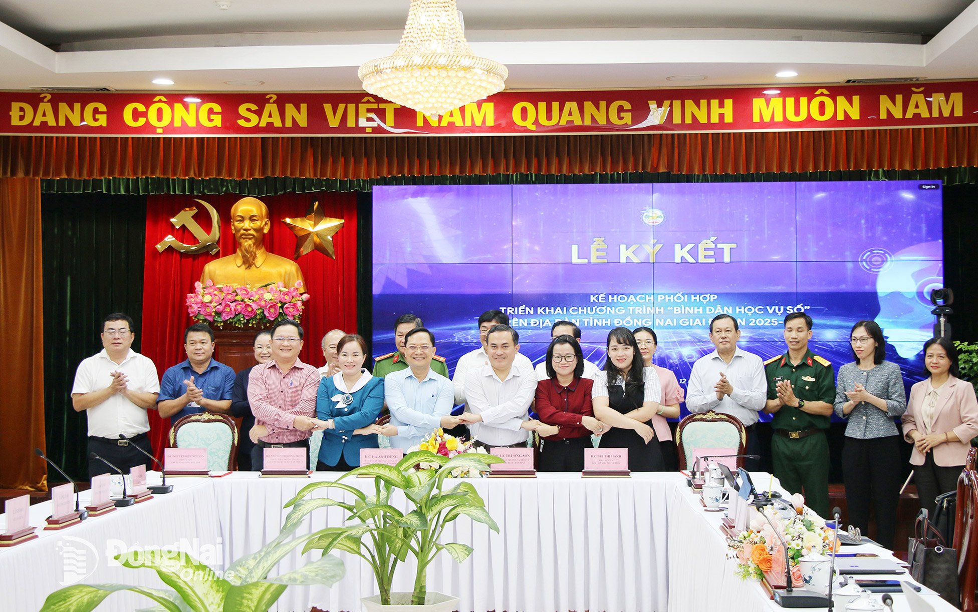 | حفل توقيع اتفاقية تعاون لتعزيز مبادرة "التعليم الرقمي للجميع" بين لجنة جبهة الوطن الأم الفيتنامية الإقليمية، واللجنة الشعبية الإقليمية، ولجنة الدعاية والتعبئة الجماهيرية التابعة للجنة الحزب الإقليمية، وجمعية المزارعين، والاتحاد النسائي، واتحاد شباب مقاطعة دونغ ناي. تصوير: هاي كوان |
