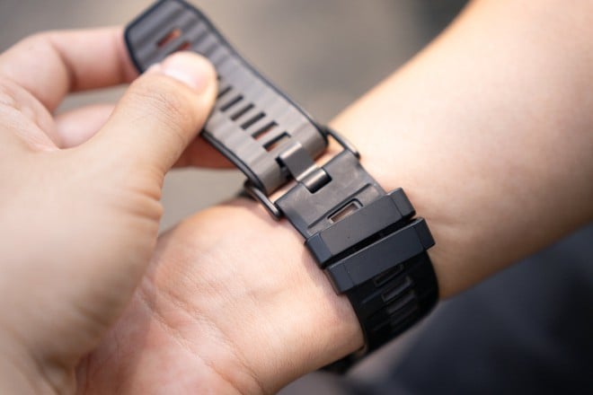 الأزرار المادية مُصممة بإتقان، وحركة الجهاز سلسة، ولا يوجد أي ارتخاء. هذه ميزة مألوفة من Garmin، وهي مفيدة بشكل خاص عند الاستخدام بأيدٍ مبللة أو أثناء الركض. حزام السيليكون المرفق ناعم، يُناسب المعصم بسهولة، ومناسب للعديد من الأنشطة عالية الكثافة. قفل الحزام مُحكم التصميم، سريع الاستخدام، ولا يُسبب أي ضيق أو انزعاج أثناء الحركات الطويلة.
