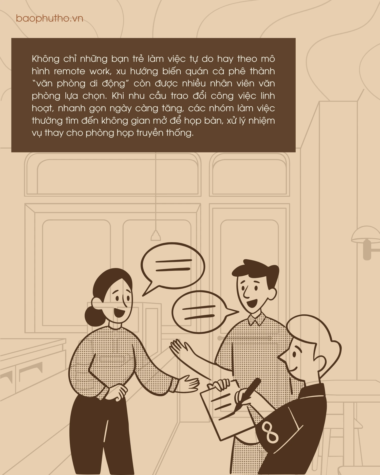 لا يقتصر الأمر على الشباب الذين يعملون لحسابهم الخاص أو يتبعون نموذج العمل عن بُعد، بل إن توجه تحويل المقاهي إلى "مكاتب متنقلة" يحظى بشعبية كبيرة بين العديد من موظفي المكاتب. ومع تزايد الحاجة إلى تبادل عمل مرن وسريع، غالبًا ما تتوجه مجموعات العمل إلى المقاهي للاجتماع وإنجاز المهام بدلًا من قاعات الاجتماعات التقليدية. ومن بين هؤلاء، السيدة نغوين ثي هانغ نغا (من دائرة فييت تري) التي تُحافظ على هذه العادة.