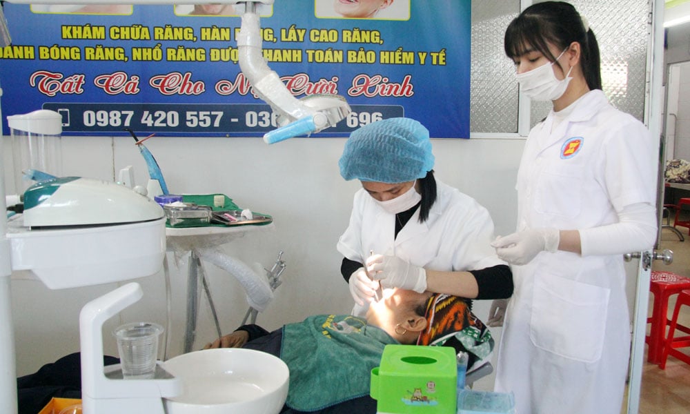 الدكتورة نجوين ثي ترانج (جالسة) تفحص أسنان المريض. |