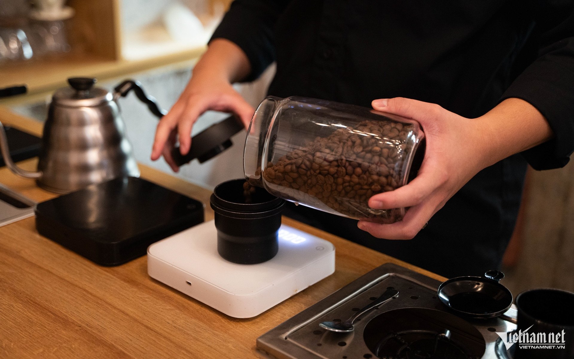 কফি বিনগুলি কাউন্টারে ঠিক পিষে রাখা হয়, সুগন্ধ গন্ধের অনুভূতিকে উদ্দীপিত করে। তারপর, কফি পাউডারটি ফিল্টারে ঢোকানো হয়, প্রায় ৯৩ ডিগ্রি সেলসিয়াসে গরম জল দিয়ে ১ মিনিট ১৫ সেকেন্ডের জন্য তৈরি করা হয়।