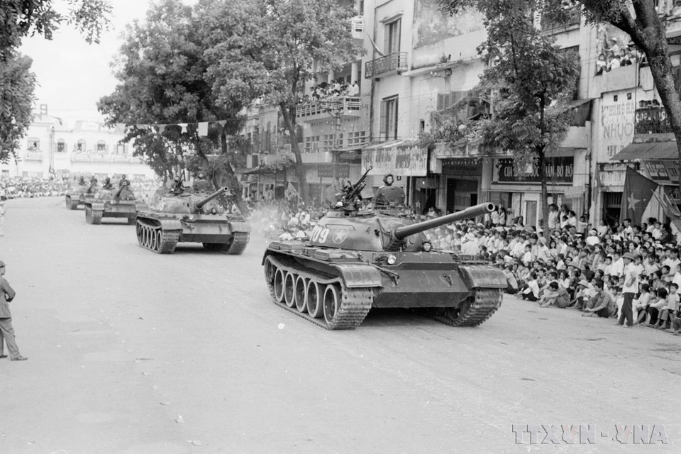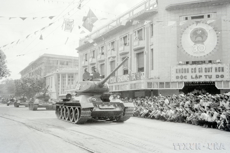 ১৯৭৫ সালের ২রা সেপ্টেম্বর সকালে হ্যানয়ের রাস্তায় সাঁজোয়া ট্যাঙ্কের কুচকাওয়াজ। ছবি: ভিএনএ