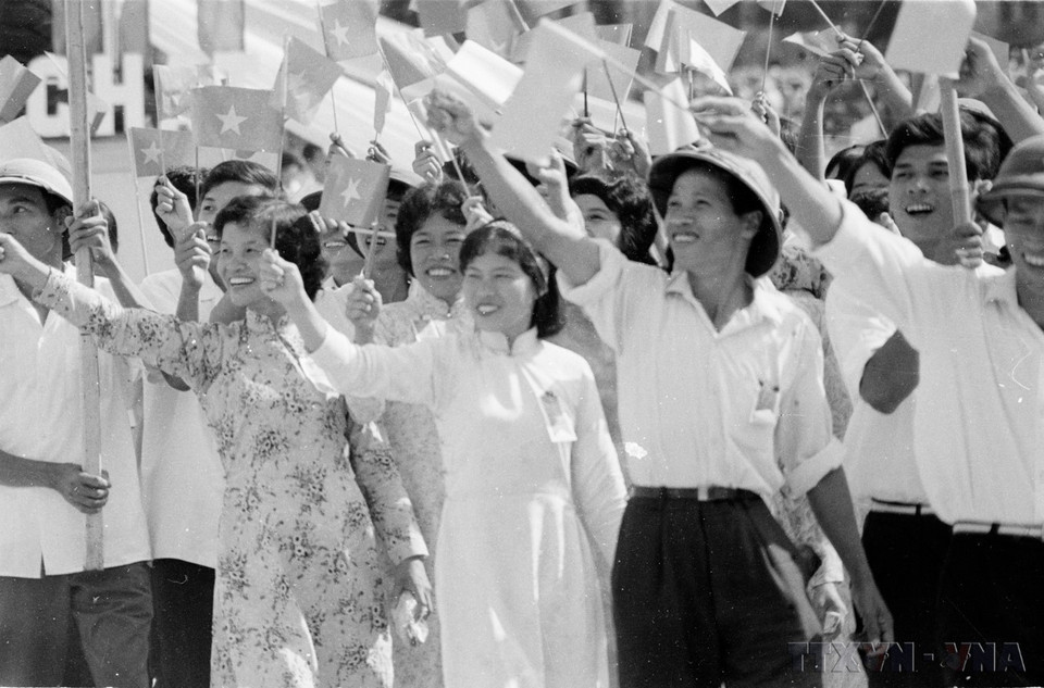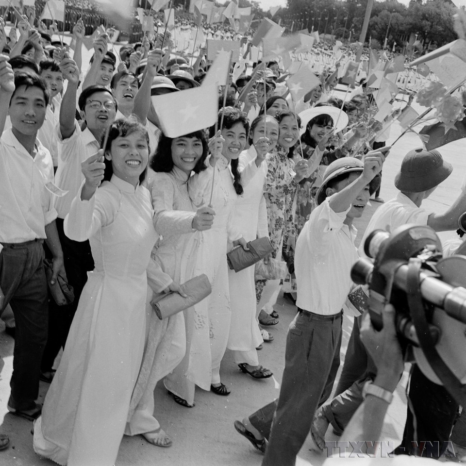 ১৯৭৫ সালের ২ সেপ্টেম্বর সকালে ভিয়েতনামের গণতান্ত্রিক প্রজাতন্ত্রের প্রতিষ্ঠার ৩০তম বার্ষিকী উদযাপনের জন্য র্যালি, কুচকাওয়াজ এবং পদযাত্রার দৃশ্য। ৪০০,০০০ এরও বেশি মানুষ এবং সৈন্য, ৬০০ জনেরও বেশি আন্তর্জাতিক প্রতিনিধি সহ উপস্থিত ছিলেন। ছবি: ভিএনএ
