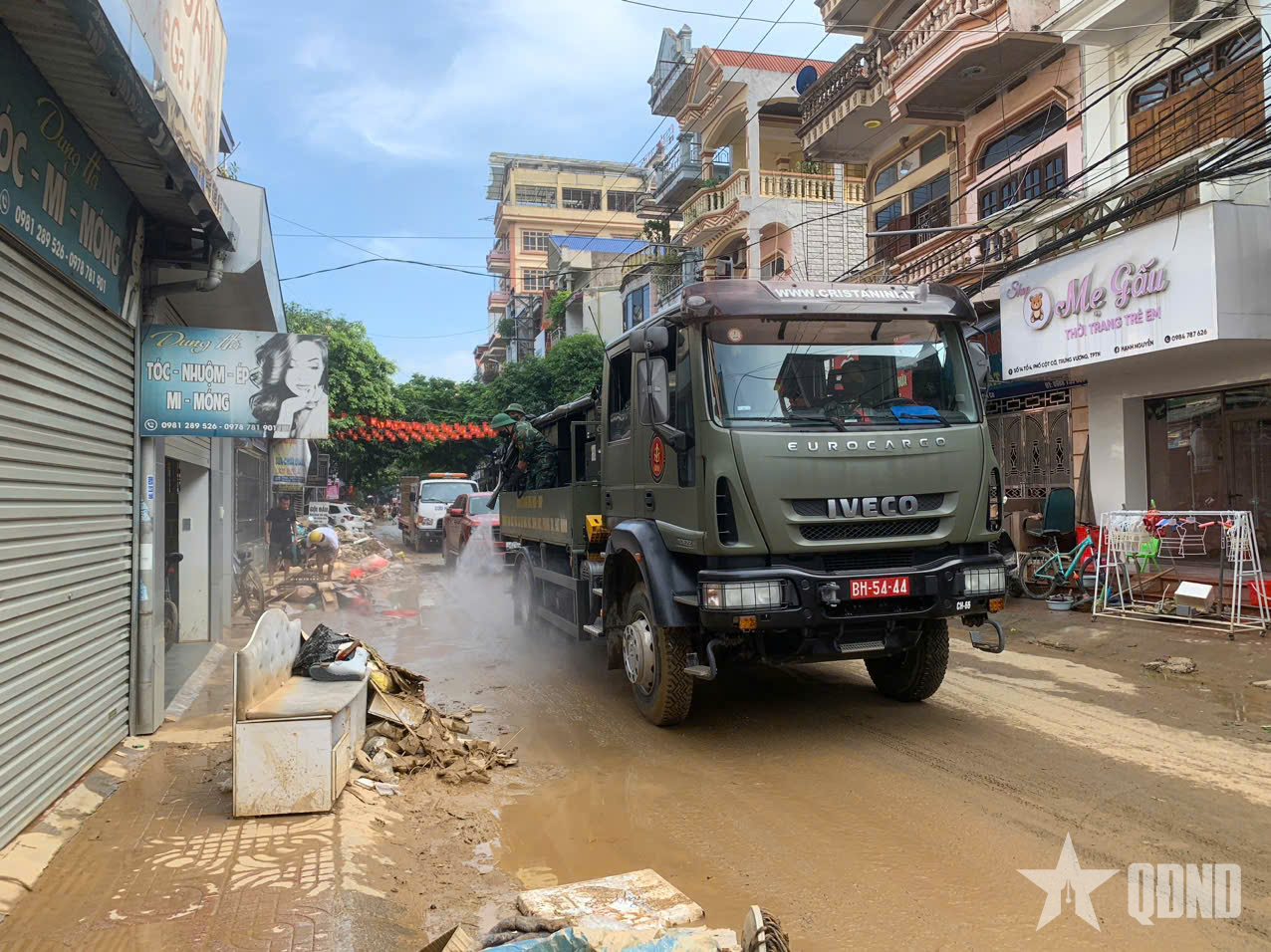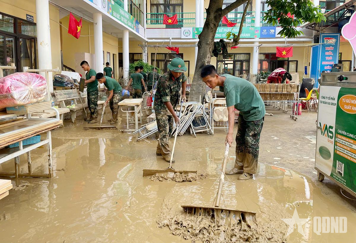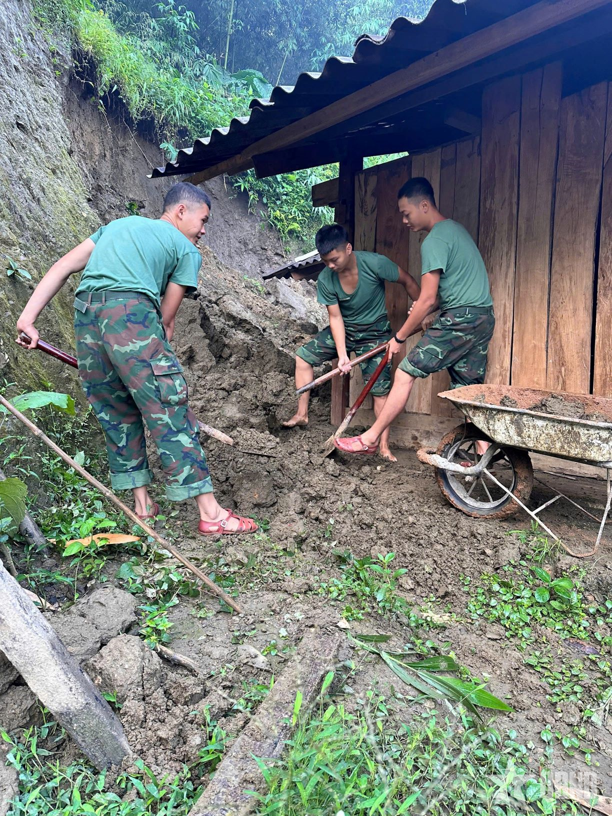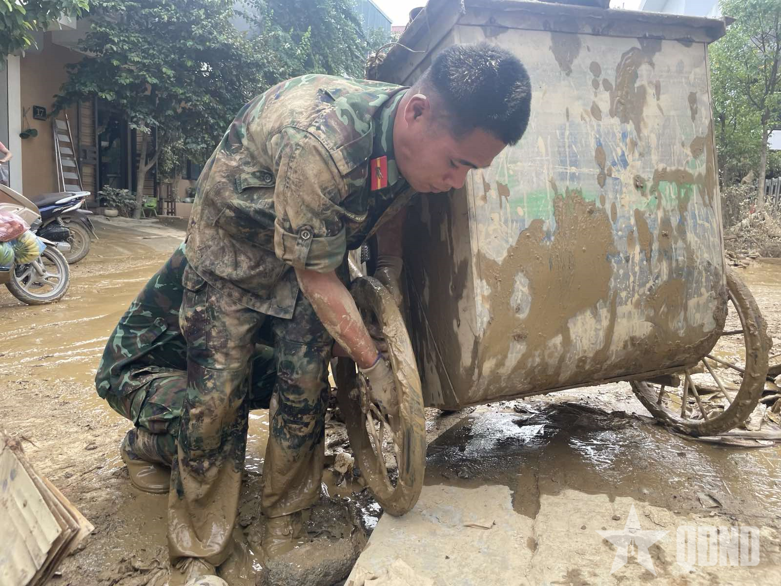থাই নগুয়েন প্রাদেশিক সামরিক কমান্ডের ৭৫০ পদাতিক রেজিমেন্টের সৈন্যরা কাও মিনের পাহাড়ি এলাকায় একটি বাড়ি থেকে কাদা এবং ভূমিধস পরিষ্কার করছে। |