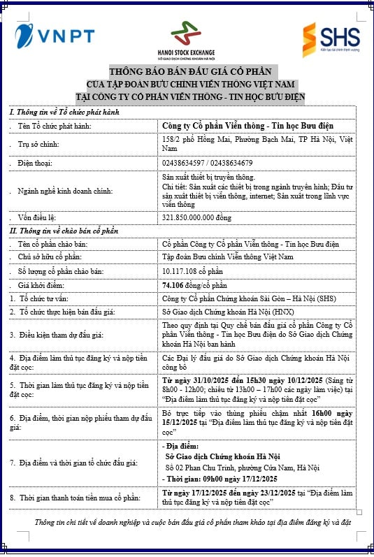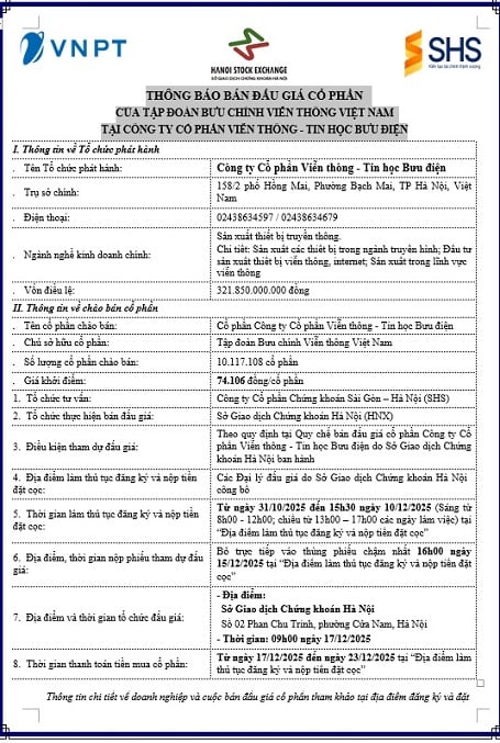 ভিয়েতনাম পোস্ট অ্যান্ড টেলিকমিউনিকেশনস গ্রুপ (VNPT) VNPT-এর মালিকানাধীন পোস্ট অ্যান্ড টেলিকমিউনিকেশনস - ইনফরমেশন টেকনোলজি জয়েন্ট স্টক কোম্পানির শেয়ার নিলামের ঘোষণা দিতে চায়।