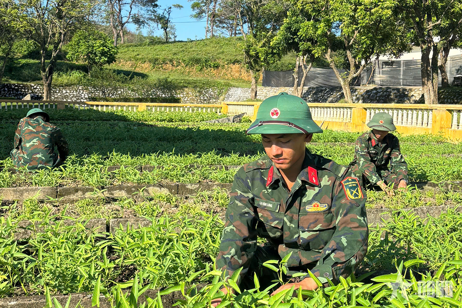 Binh nhất La Văn Long, chiến sĩ Đại đội Đảo Vĩnh Thực cùng đồng đội đẩy mạnh tăng gia, chăm sóc vườn rau xanh của đơn vị. |