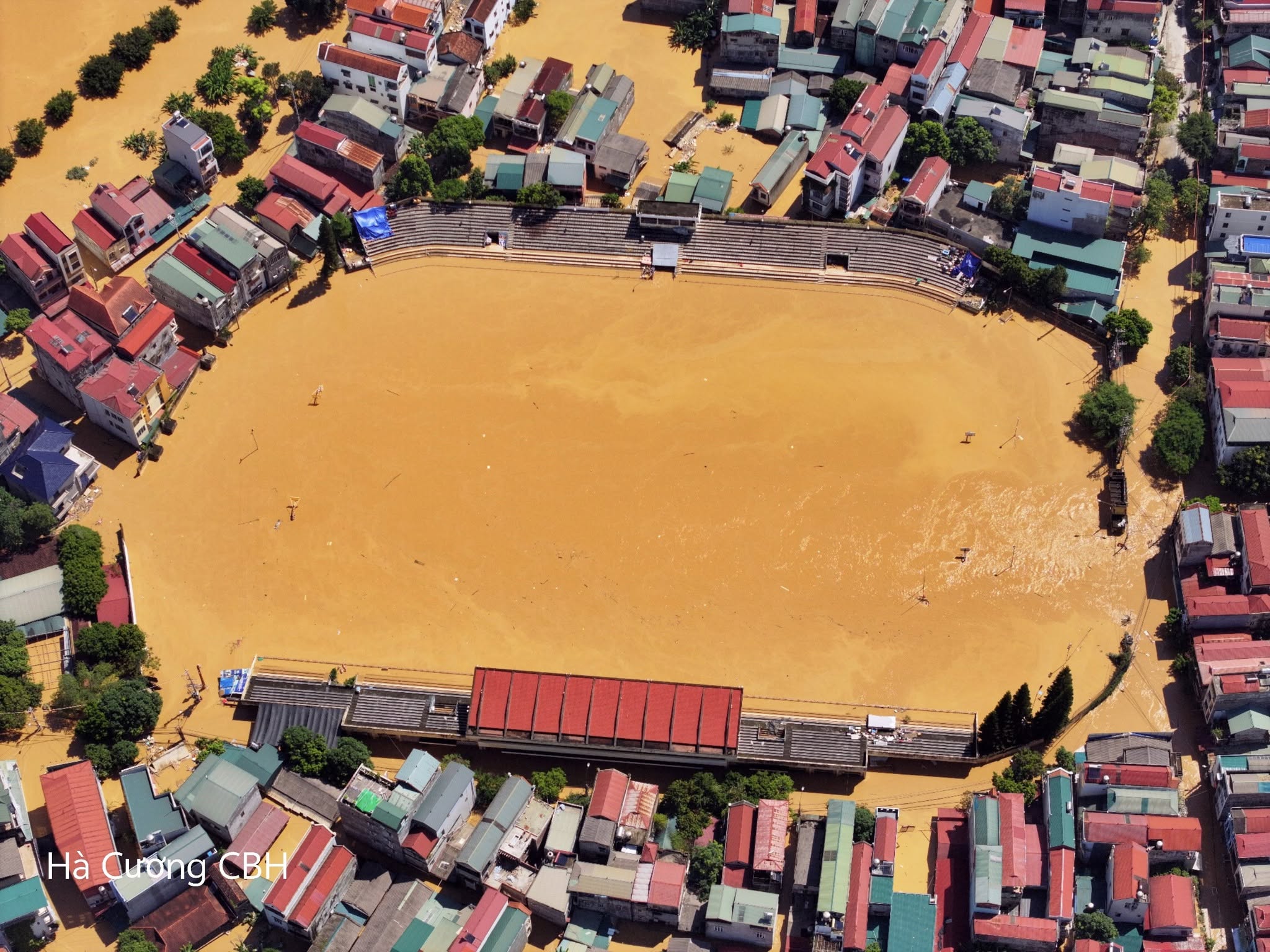 Từ trên cao nhìn xuống, khu vực trung tâm Cao Bằng hiện lên như một vùng sông nước mênh mông. Nhiều khu dân cư bị nhấn chìm, nước lũ dâng cao phủ kín mái nhà trong trận lũ lịch sử do hoàn lưu cơn bão số 11 (Matmo).