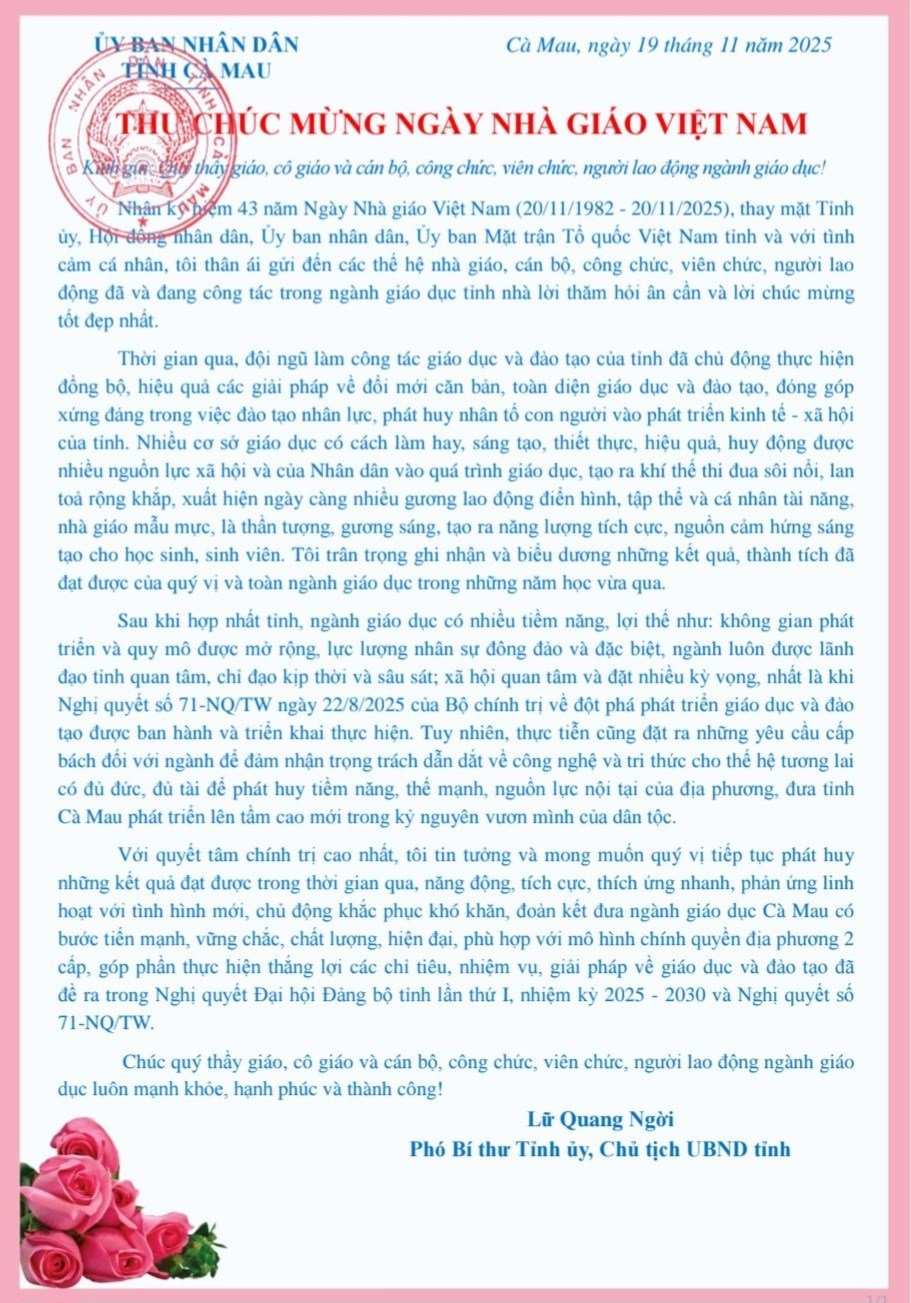 Nhân kỷ niệm 43 năm ngày Nhà giáo Việt Nam (20/11/1982 - 20/11/2025), thay mặt Tỉnh ủy, Hội đồng nhân dân, Ủy ban nhân dân, Ủy ban Mặt trận Tổ quốc Việt Nam tỉnh và với tình cảm cá nhân, tôi thân ái gửi đến các thế hệ nhà giáo, cán bộ, công chức, viên chức, người lao động đã và đang công tác trong ngành giáo dục tỉnh nhà lời thăm hỏi ân cần và lời chúc mừng tốt đẹp nhất.