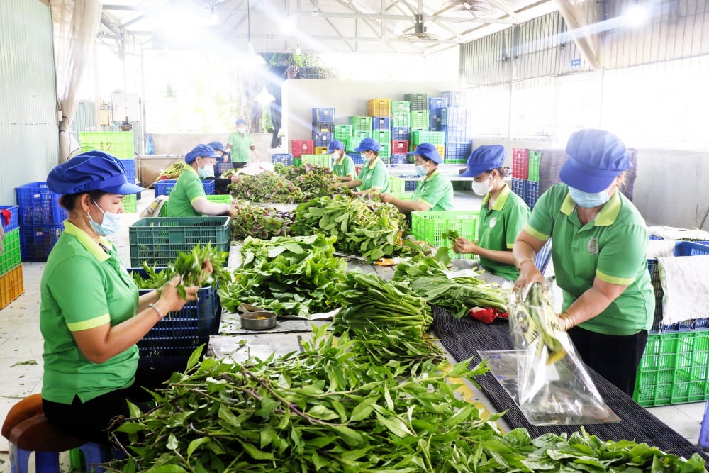 Công nhân Hợp tác xã Rau an toàn Mười Hai sơ chế, phân loại rau trước khi đóng gói, bảo đảm quy trình an toàn thực phẩm