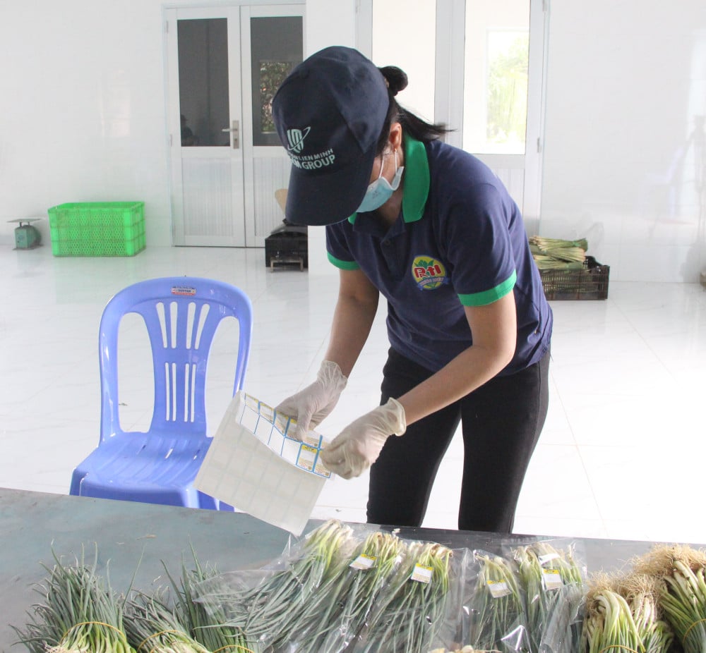 Nhân viên Hợp tác xã Rau an toàn Phước Hiệp dán tem truy xuất nguồn gốc lên sản phẩm trước khi cung cấp cho siêu thị và bếp ăn tập thể