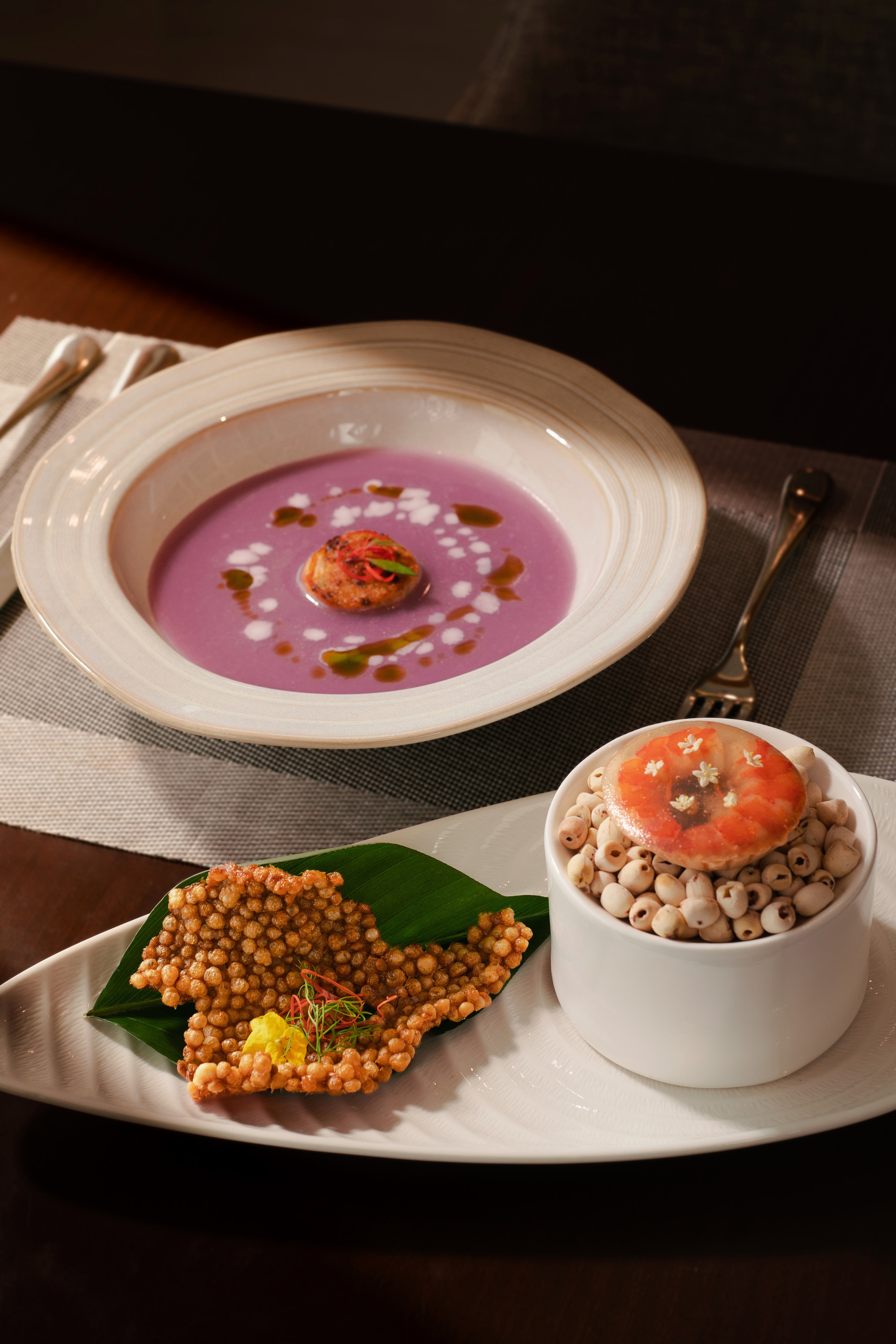 Jídlo je obaleno v křupavém smaženém krabím koláčku, což vytváří zajímavý kontrast mezi křupavostí a měkkostí, a proto je lákavé, aniž by bylo příliš těžké. K krabímu koláčku se podává jemná, světle fialová taro polévka se sladkou, zemitou chutí připomínající domov. Taro – skromná kořenová zelenina, která se běžně vyskytuje ve vietnamských rodinných jídlech – dokonale vyvažuje bohatou sladkost kraba a vytváří harmonickou a příjemnou celkovou chuť. To vše vede k harmonické směsi sladkosti moře a klidu severovietnamské krajiny.