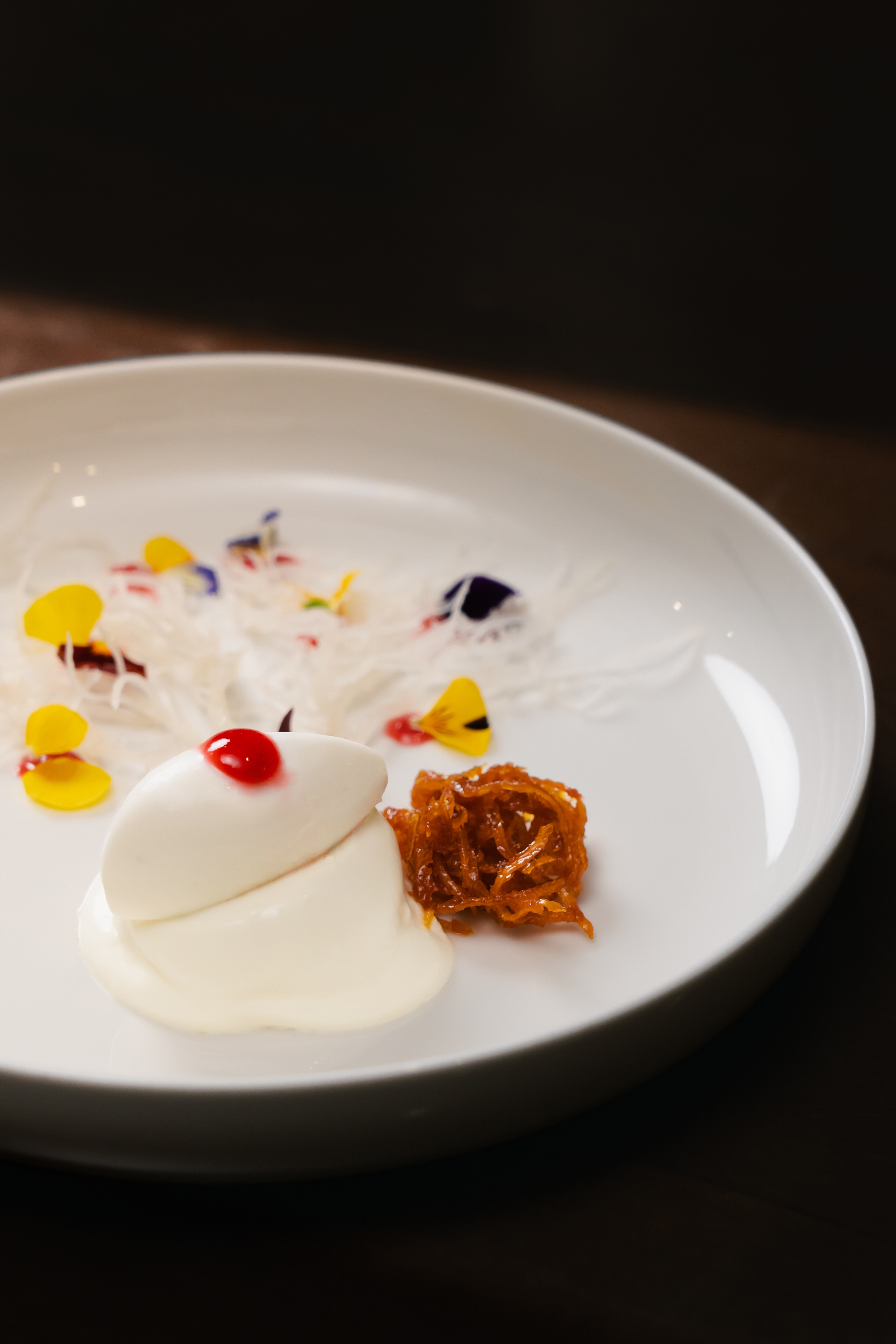 Tofu (nebo tvaroh) se ztužuje pomocí přírodních mořských řas namísto průmyslových zahušťovadel, což má za následek měkkou, hladkou texturu a jedinečně osvěžující chuť. Mořské řasy nejen pomáhají vytvořit přirozené prostředí, ale také zanechávají jemnou minerální dochuť, která evokuje esenci moře. Dovedně zkombinoval tofu ztužené mořskými řasami s liči zmrzlinou a panna cottou ze soursopu – vytvořil čistý a harmonický dezert, který spojuje moře a zemi, minulost a současnost.