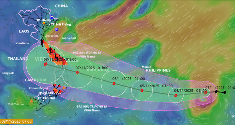 Poloha a směr bouře Kalmaegi, aktualizováno ráno 3. listopadu. Foto: NCHMF