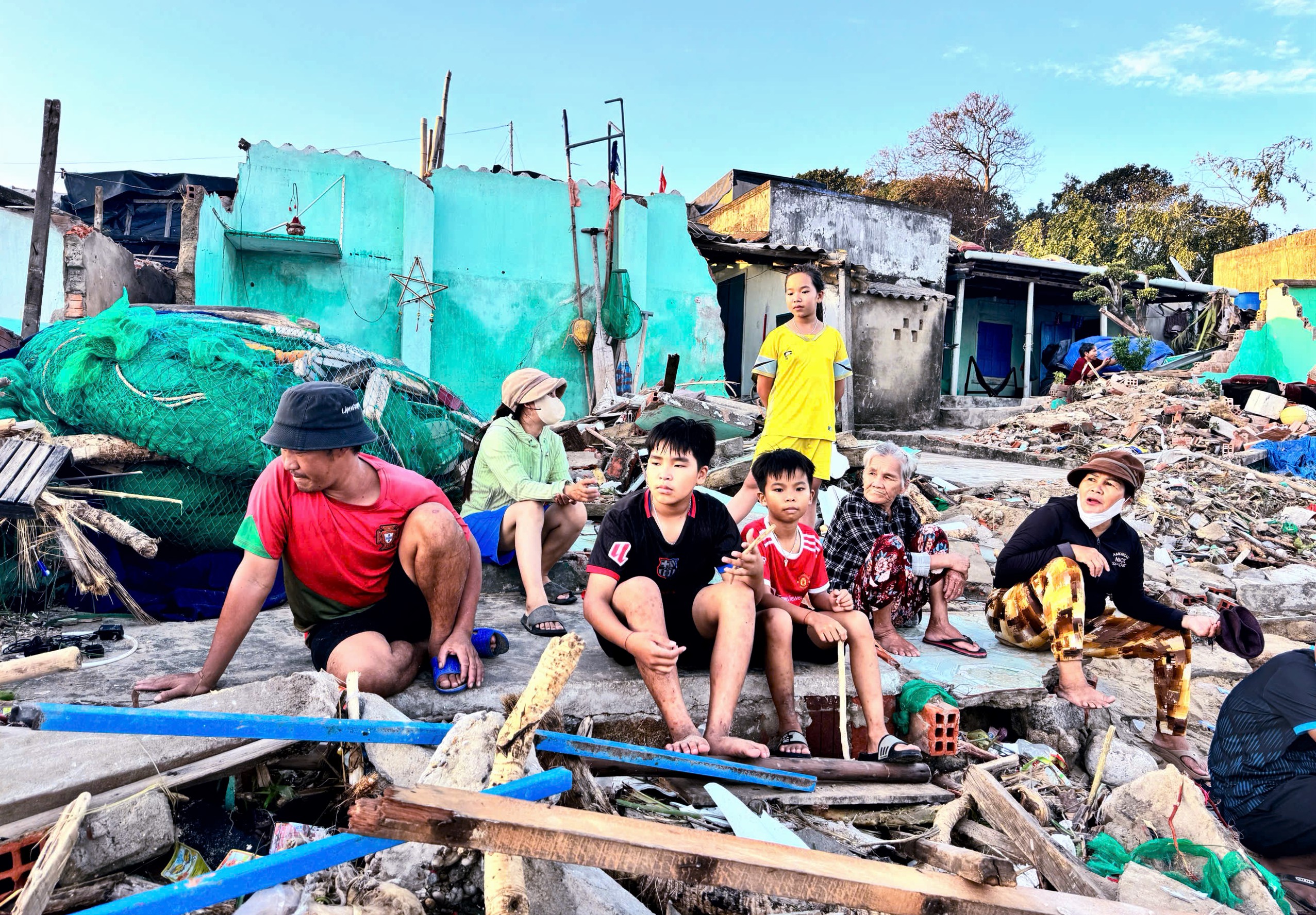 V pobřežní osadě My An, obce Phu My Dong, ve světle nového dne. Rybářská vesnice, schoulená pod pískem, je nyní hromadou sutin. Žádná střecha, žádné dveře, jen země potřísněná vodou a lidskými stopami. Vítr po bouři stále fouká skrz rozbité dřevěné rámy a vydává zvuk jako vzlykání země.