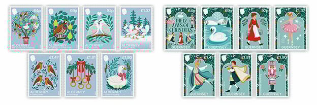 Každá sada obsahuje sedm nominálních hodnot: 64 pencí, 69 pencí, 92 pencí, 1,37 pence, 1,47 pence, 1,81 pence a 1,90 pence. Známka v hodnotě 64 pencí sdílí téma „12 dní Vánoc“, zatímco zbývajících 12 návrhů zobrazuje verše ze stejnojmenné koledy.