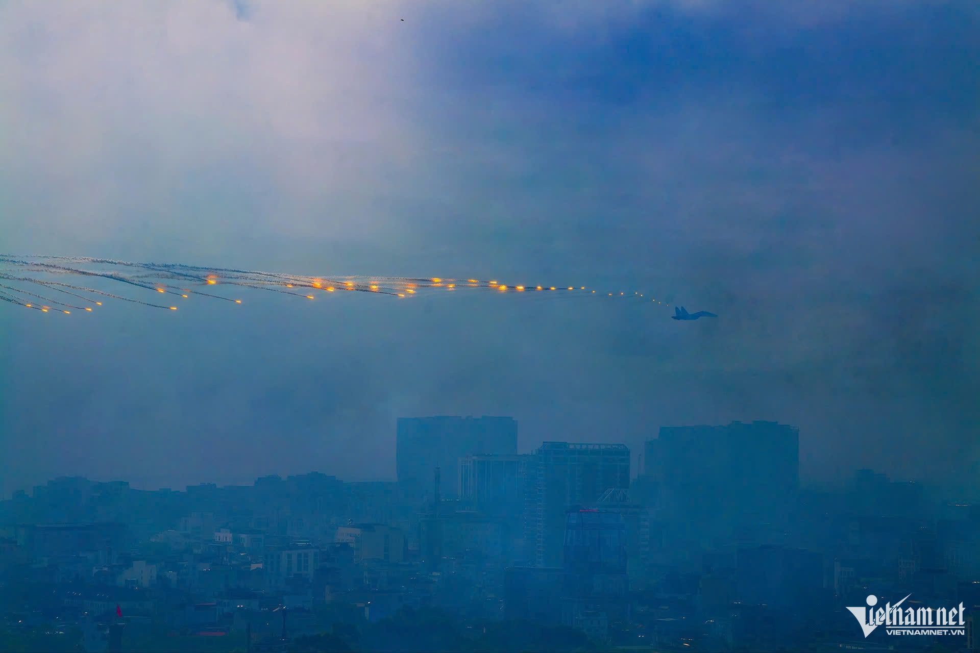 Poté stíhačka Su-30MK2 přeletěla nad náměstím Ba Dinh a odhodila tepelné pasti. Foto: The Bang