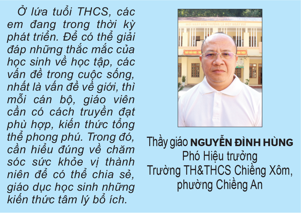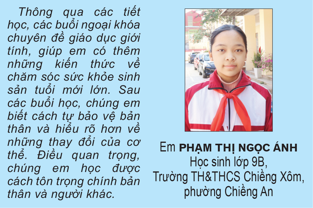 Vrcholem je, že Základní a střední škola Chieng Xom zřídila školní psychologický poradenský tým s 5 členy, kteří vždy věnují pozornost a naslouchají; vytvářejí tak most pro studenty, aby mohli odvážně vyjadřovat svá přání a otázky. Díky tomu se znalosti sexuální výchovy stávají důležitým přínosem, který pomáhá studentům sebevědomě a pevně vstoupit do dospělosti.