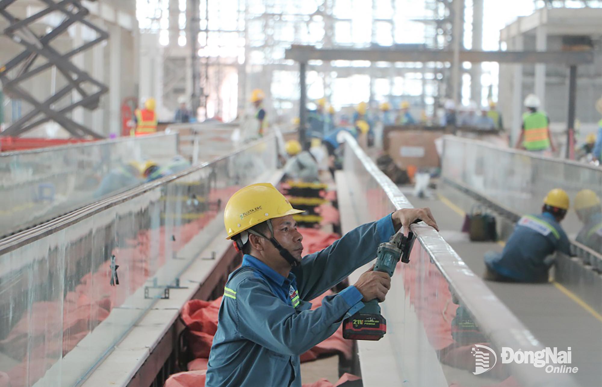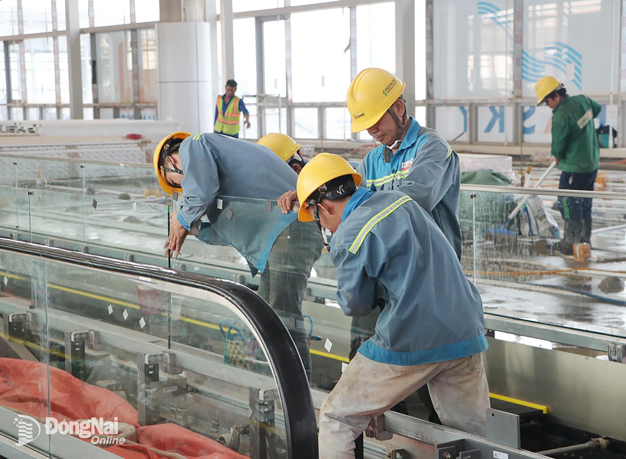 | Probíhá instalace schodiště pro pěší uvnitř terminálu pro cestující na letišti Long Thanh. Foto: Pham Tung |