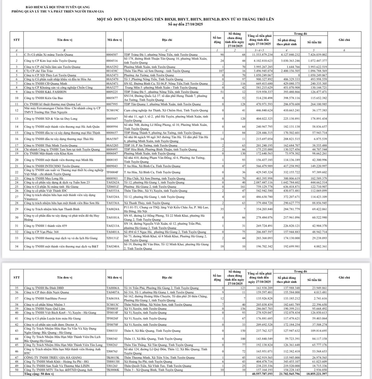 Provinční sociální pojištění ve spolupráci s novinami a rozhlasem a televizí Tuyen Quang zveřejnilo seznam 50 jednotek, které se opozdily s placením sociálního pojištění, zdravotního pojištění a pojištění v nezaměstnanosti o 3 měsíce nebo déle.