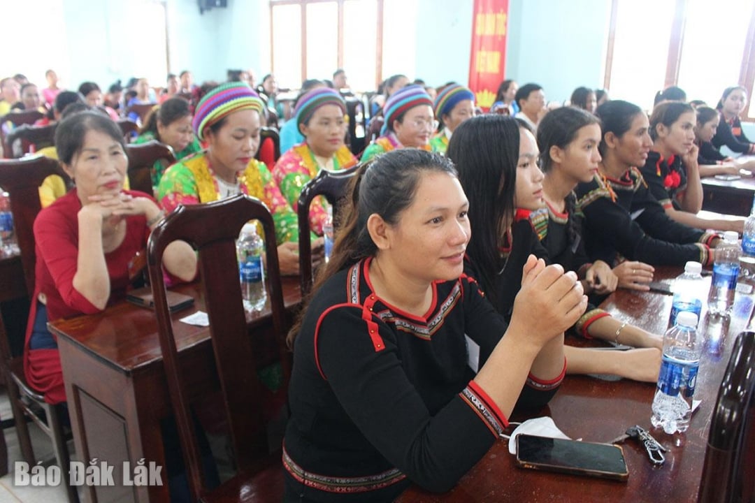 | Lidé se účastní propagandistického setkání pořádaného Ženskou unií obce Ea Kiet. |