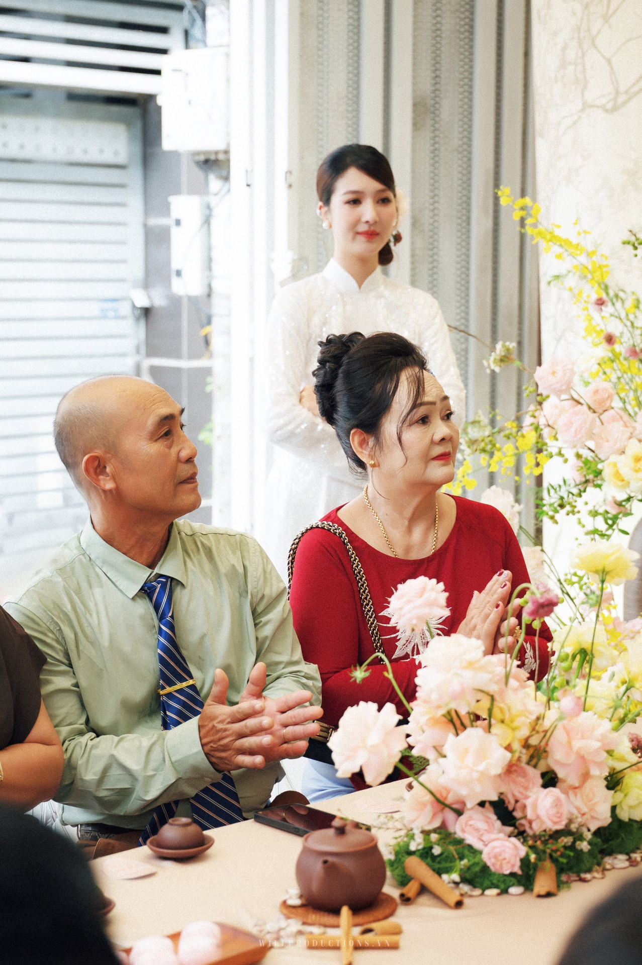 Nevěsta a ženich se objevili v bílých ao dai, zářivě stáli vedle sebe a přitahovali všechny pohledy. Svatební prostor byl jednoduchý i luxusní zároveň, evokoval pocit intimity, ale přesto plný uměleckého řemesla.