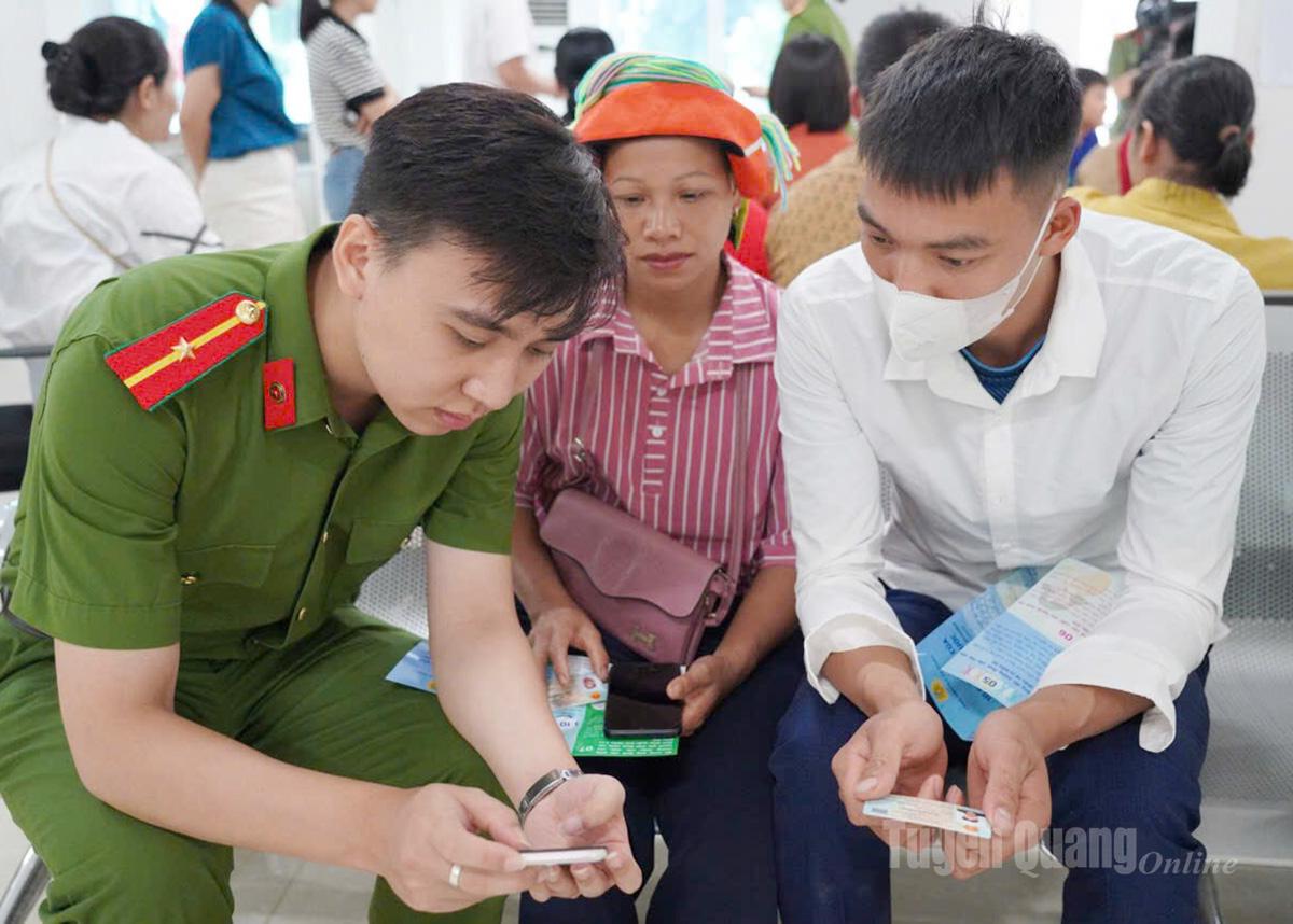 | Policisté z okrsku Ha Giang 1 pomáhají lidem s nastavením elektronických identifikačních účtů úrovně 2. |