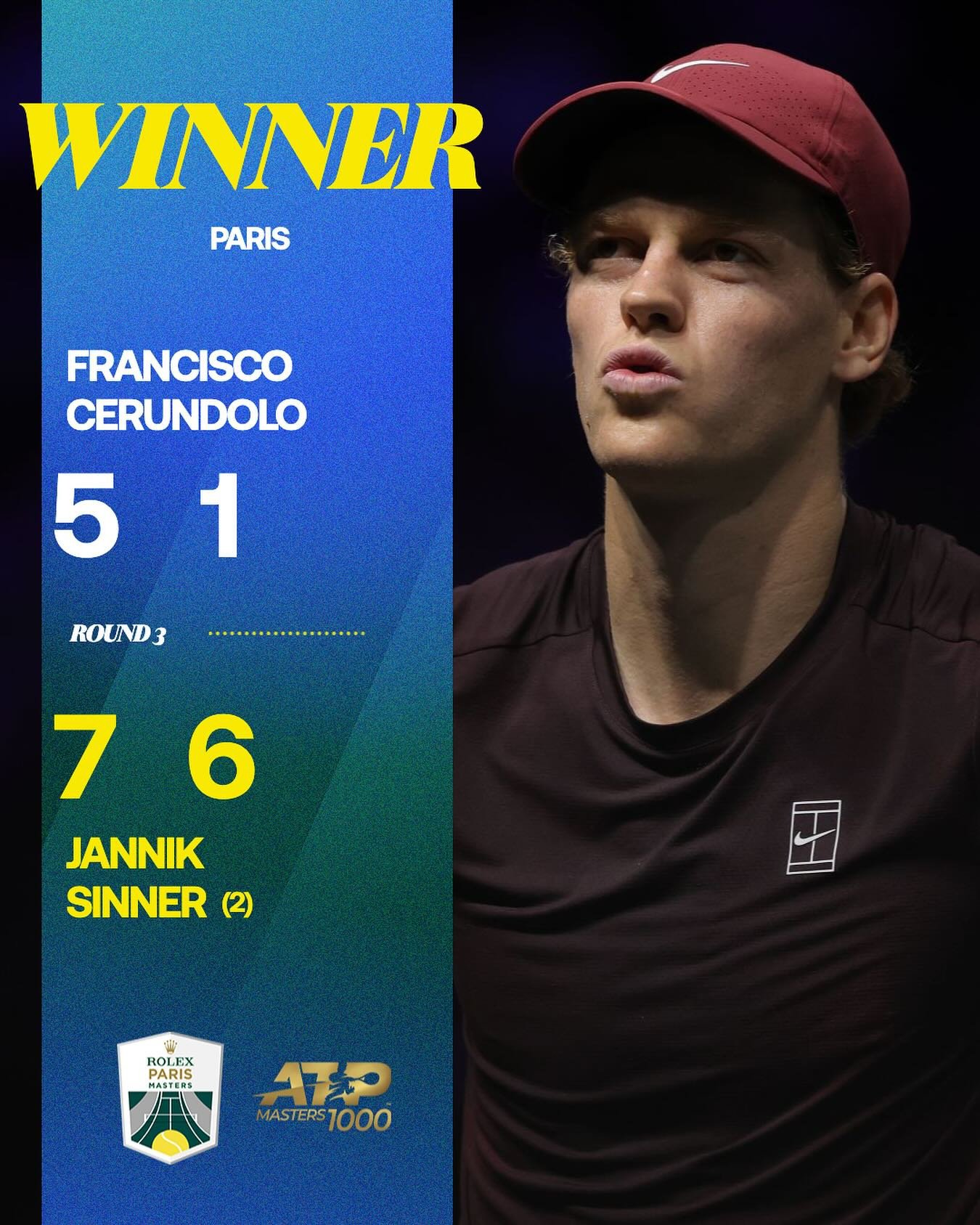 Sinner nakonec vyhrál 2:0 (7:5, 6:1) a oficiálně postoupil do čtvrtfinále Paris Masters 2025, kde se utká s pátým nasazeným Benem Sheltonem.