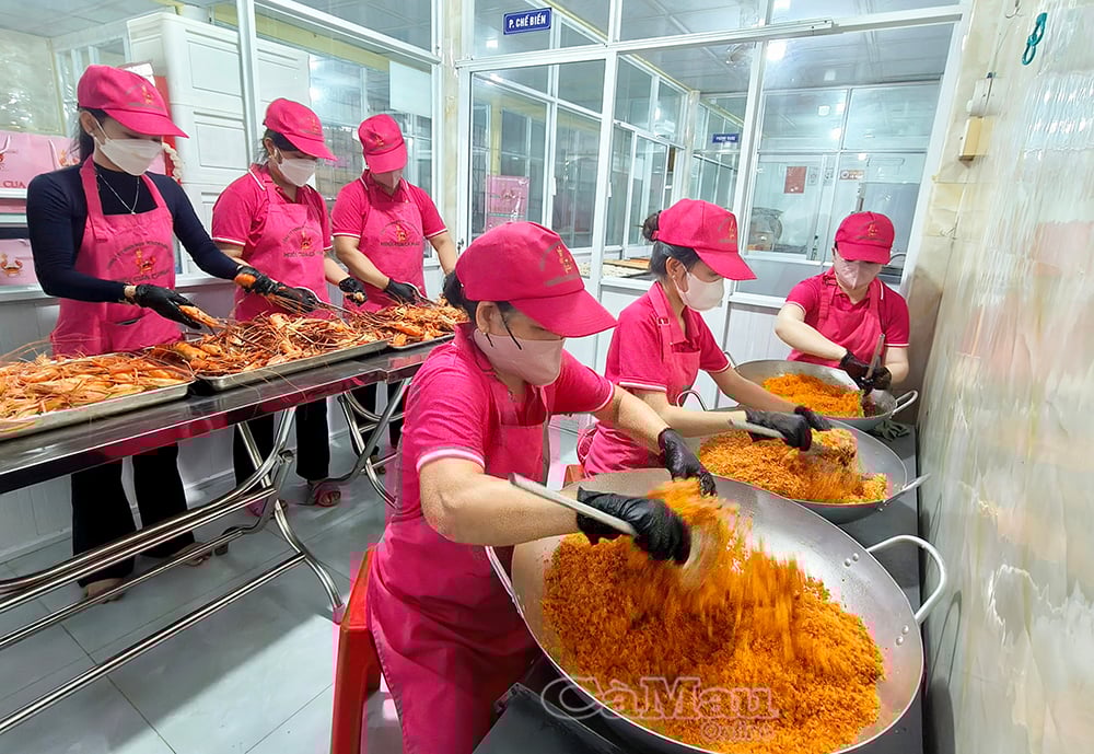 Výrobní zařízení, která vyrůstají přímo v oblasti surovin, přispívají k vytváření pracovních míst pro mnoho místních pracovníků. (Foto: Dělníci provádějící solení krabů v závodě Huong Bao Chau, obec U Minh).