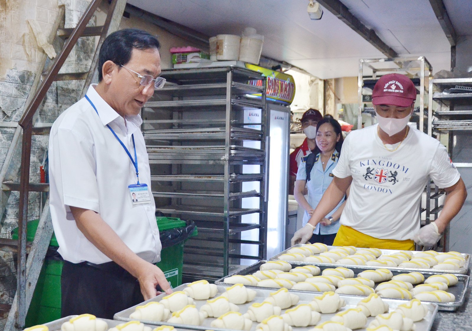 Interdisciplinární delegace Lidového výboru okresu Rach Gia provedla kontrolu bezpečnosti potravin v zařízeních vyrábějících a obchodujících s koláči z mouky. Foto: MI NI