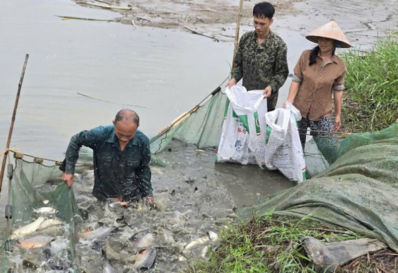 | Veterán Pham Ba Tan a jeho rodina loví ryby. |