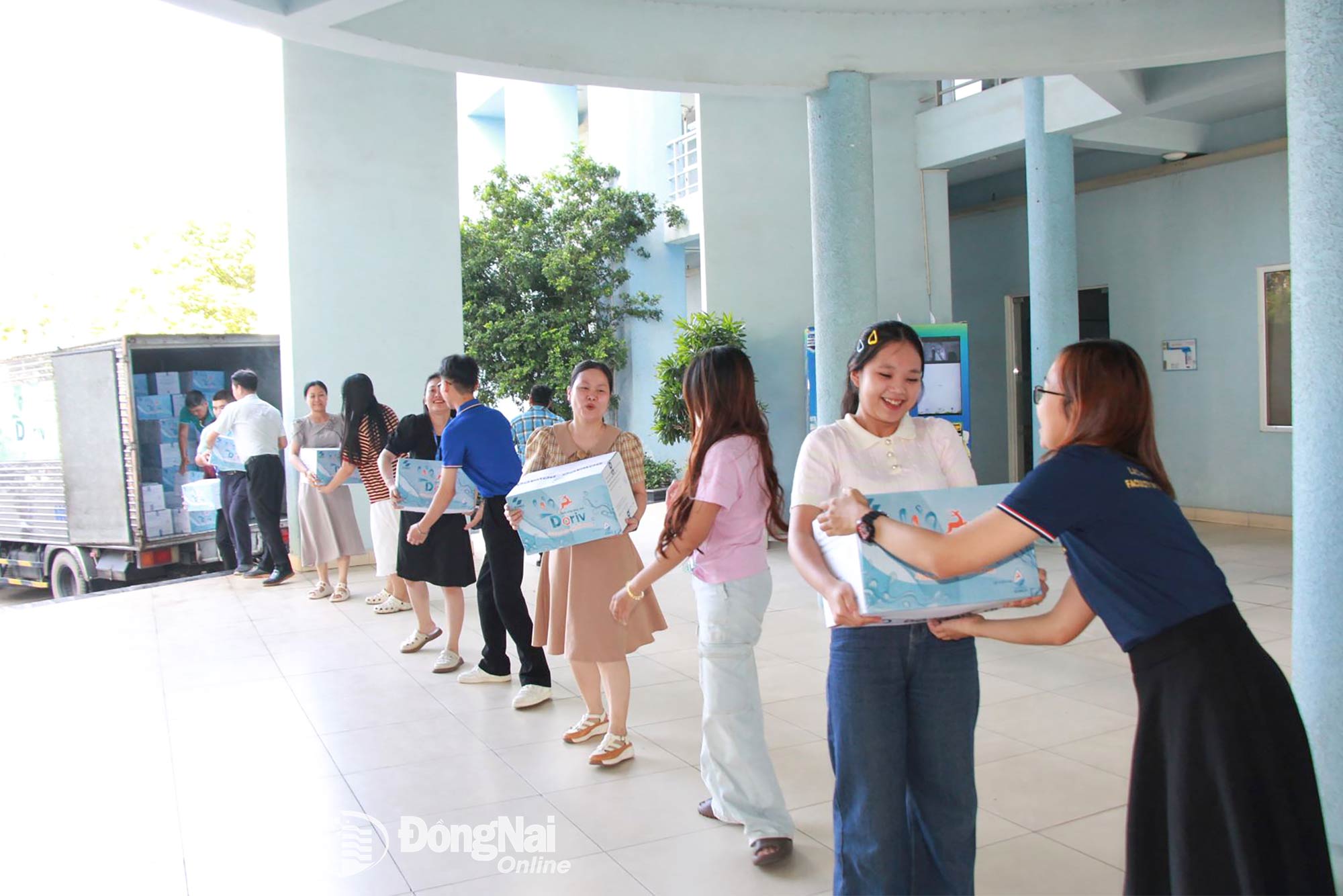 | Přednášející, zaměstnanci a studenti Univerzity Lac Hong dostávají pitnou vodu, kterou budou dávat lidem v provinciích Centrální a Střední vysočina postižených bouřemi a povodněmi. Foto: Nga Son |