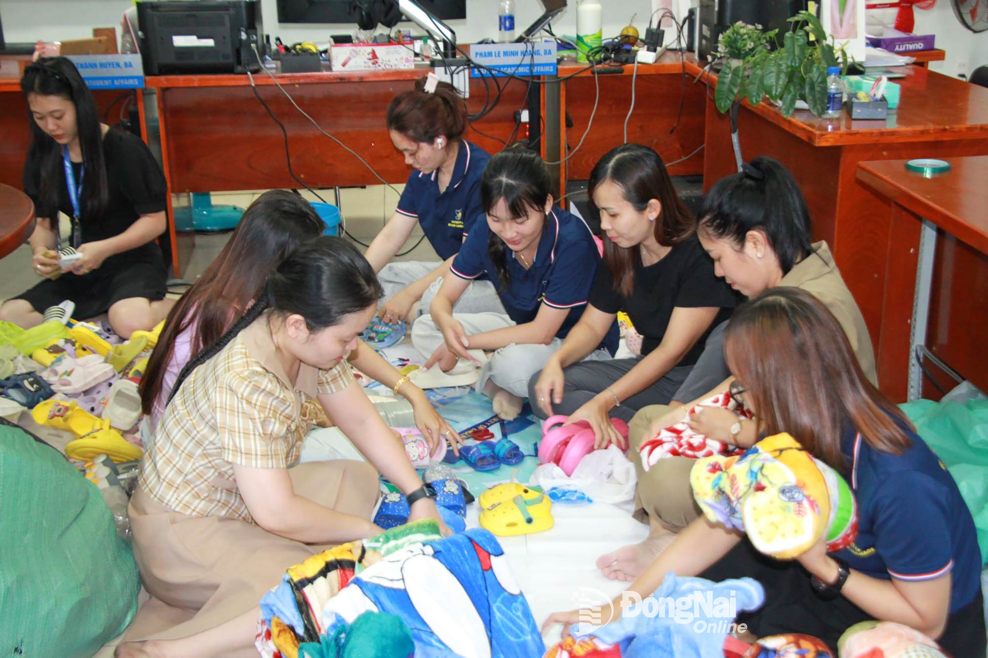 | Přednášející, zaměstnanci a studenti Univerzity Lac Hong třídí každý pár sandálů a dek, které budou zaslány lidem v provinciích Centrální a Střední vysočina postižených bouřemi a povodněmi. Foto: Nga Son |