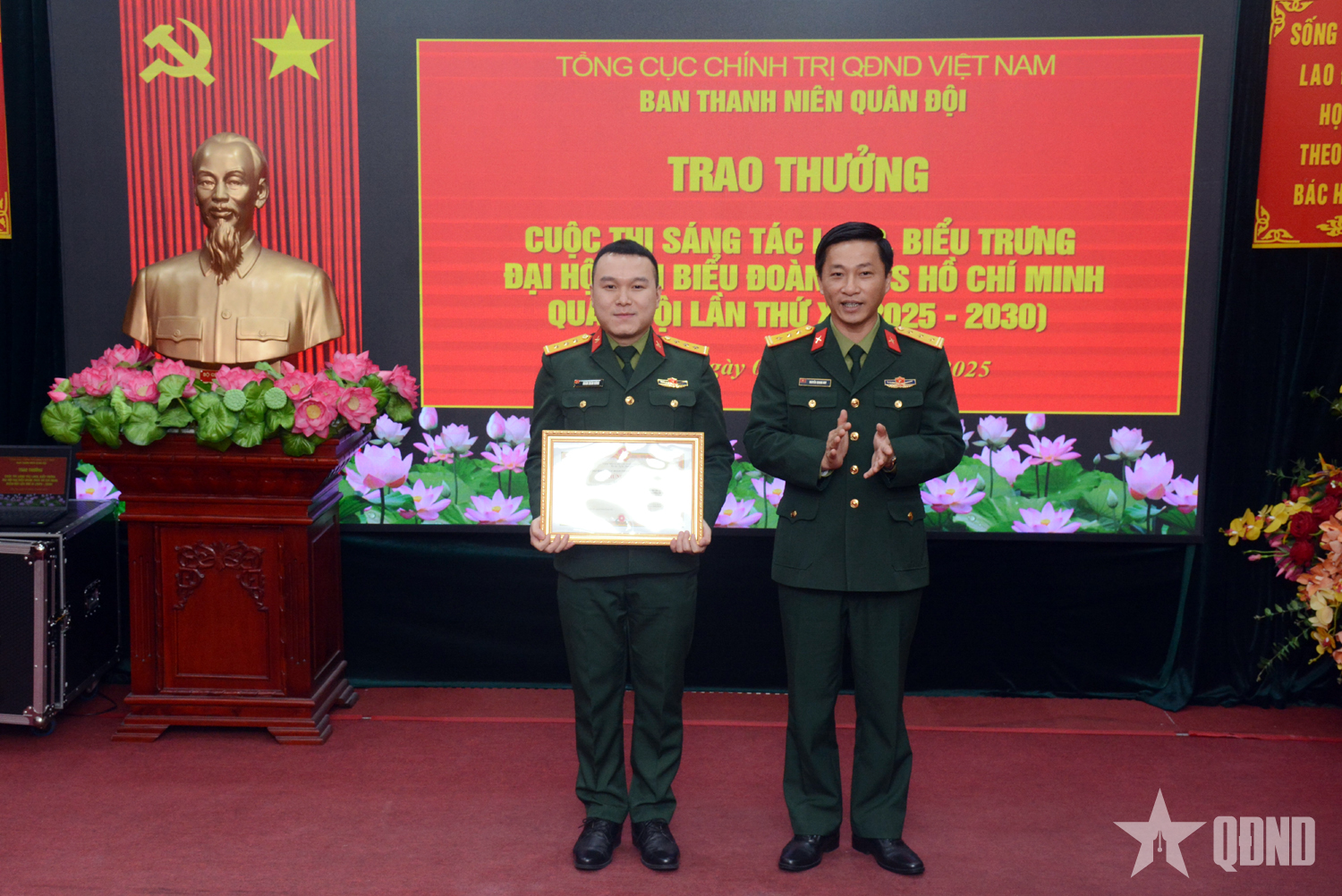 | Thượng tá Nguyễn Quang Huy trao thưởng cho đại diện nhóm tác giả đoạt giải nhất cuộc thi sáng tác logo, biểu trưng Đại hội đại biểu Đoàn TNCS Hồ Chí Minh Quân đội lần thứ XI. |