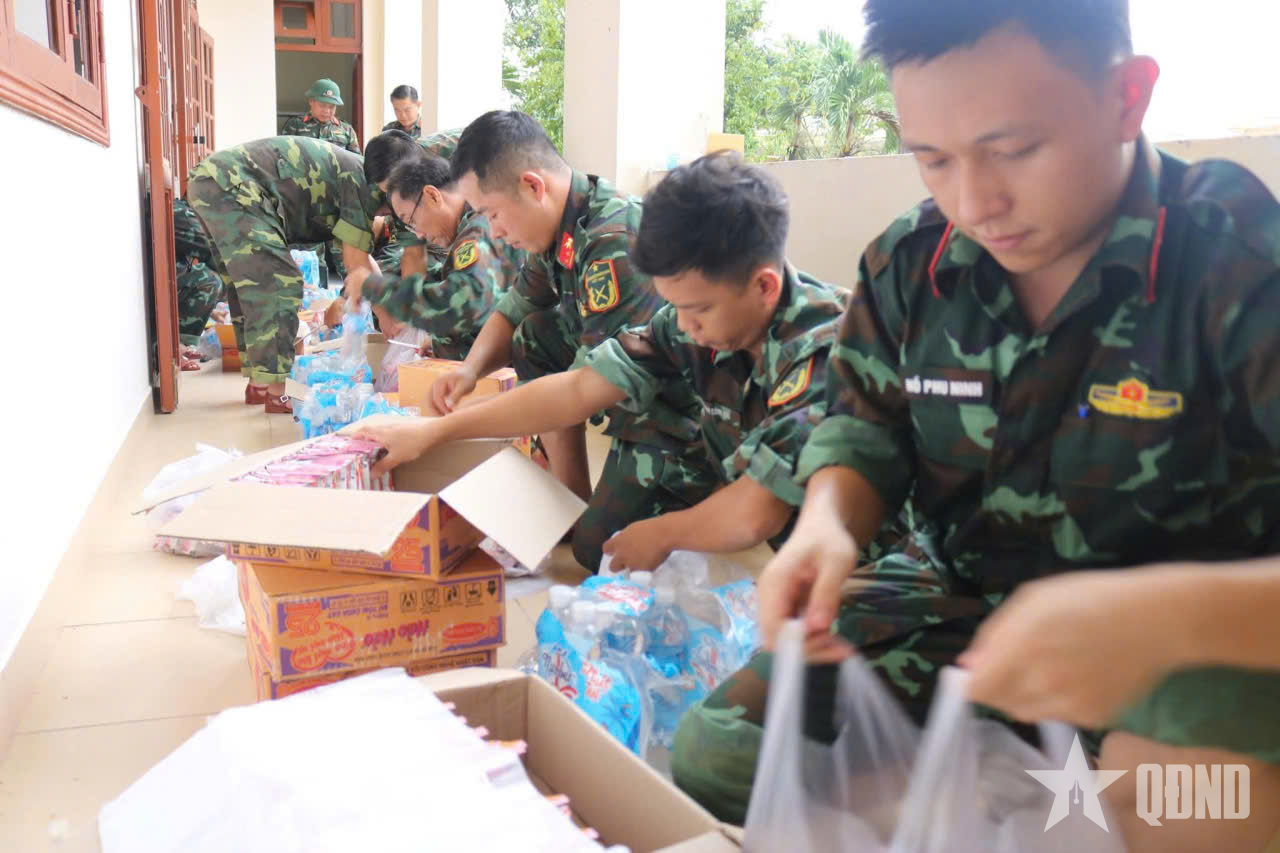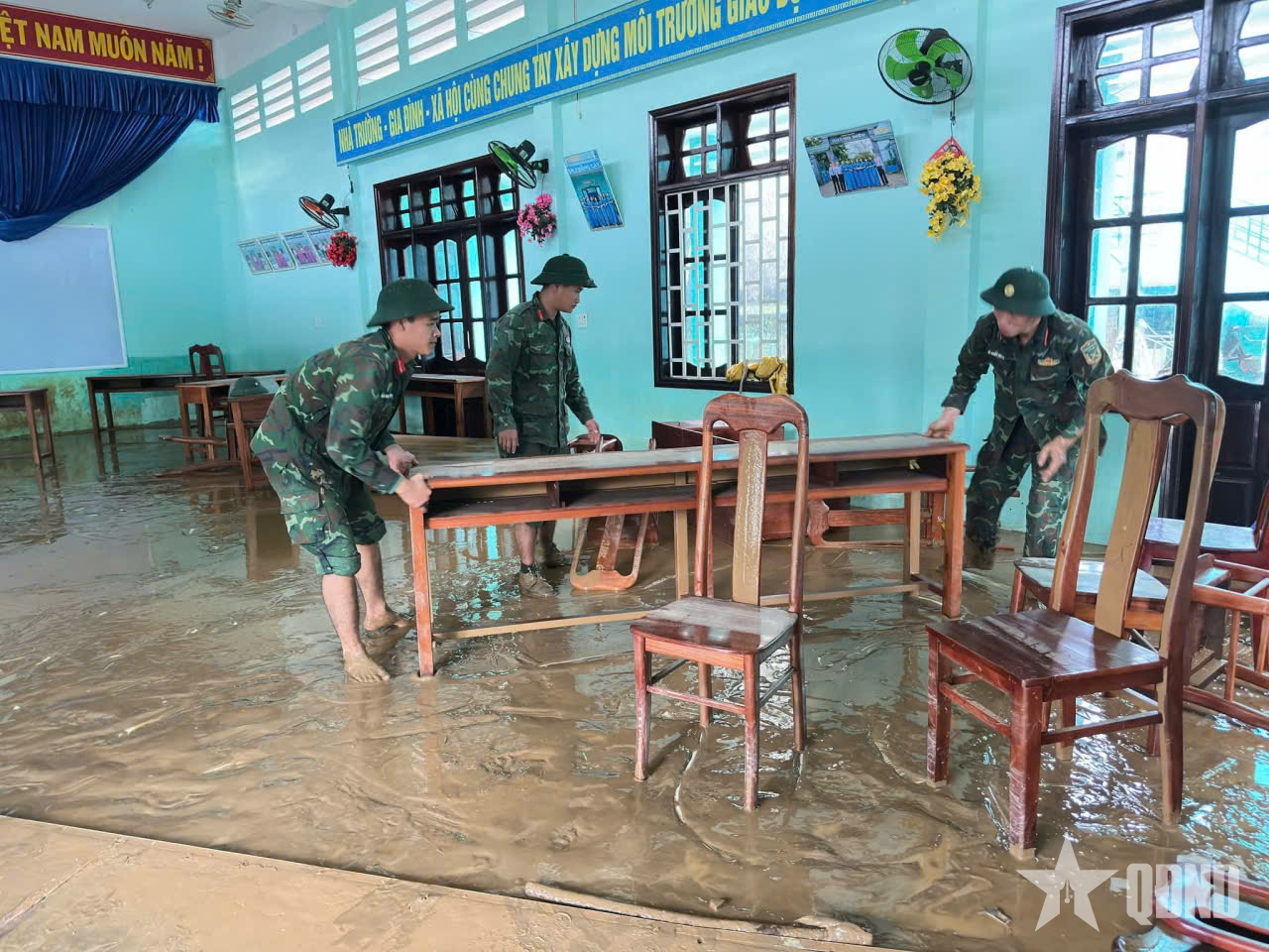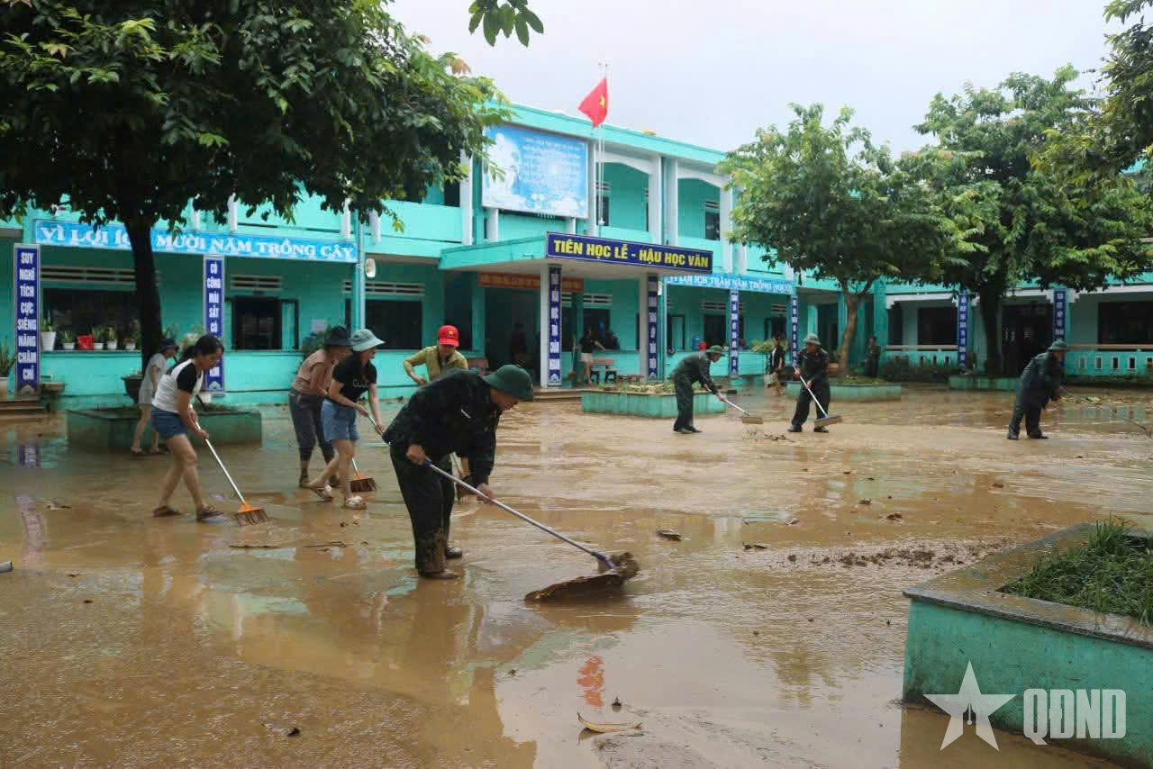 In der Gemeinde Nong Son in Da Nang unterstützten Offiziere und Soldaten des Technischen Lagers K55 weiterhin die Hoang-Dieu-Grundschule bei der Schlammbeseitigung, dem Abwaschen von Tischen und Stühlen, der Reinigung der Klassenzimmer und der Beseitigung von Wasserschäden. Dadurch trugen sie dazu bei, dass die Schule nach der Überschwemmung schnellstmöglich wieder den Unterricht aufnehmen konnte. Am selben Tag organisierte die Einheit außerdem einen Einsatz in das Dorf Ninh Khanh in der Gemeinde Que Phuoc, um 60 Hilfsgüter (Instantnudeln, gereinigtes Trinkwasser) an die von den Überschwemmungen betroffenen Haushalte zu verteilen.