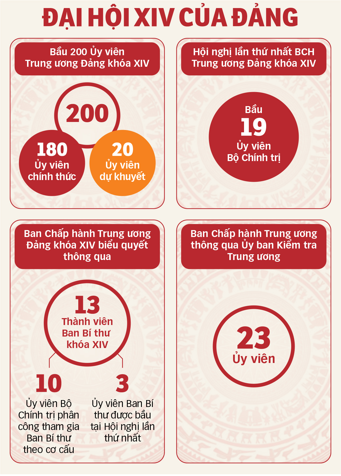 Das 14. Politbüro wurde mit 19 Mitgliedern gewählt, und das 14. Zentralsekretariat der Partei hatte 13 Mitglieder, darunter 10 vom Politbüro zur Teilnahme entsandte Politbüromitglieder und 3 gewählte Mitglieder: Frau Vo Thi Anh Xuan - Mitglied des Zentralkomitees, Vizepräsidentin; Frau Pham Thi Thanh Tra - Mitglied des Zentralkomitees, Ständiger Ausschuss des Regierungsparteikomitees, stellvertretende Premierministerin; und Herr Nguyen Van Quang - Mitglied des Zentralkomitees, Präsident des Obersten Volksgerichts.