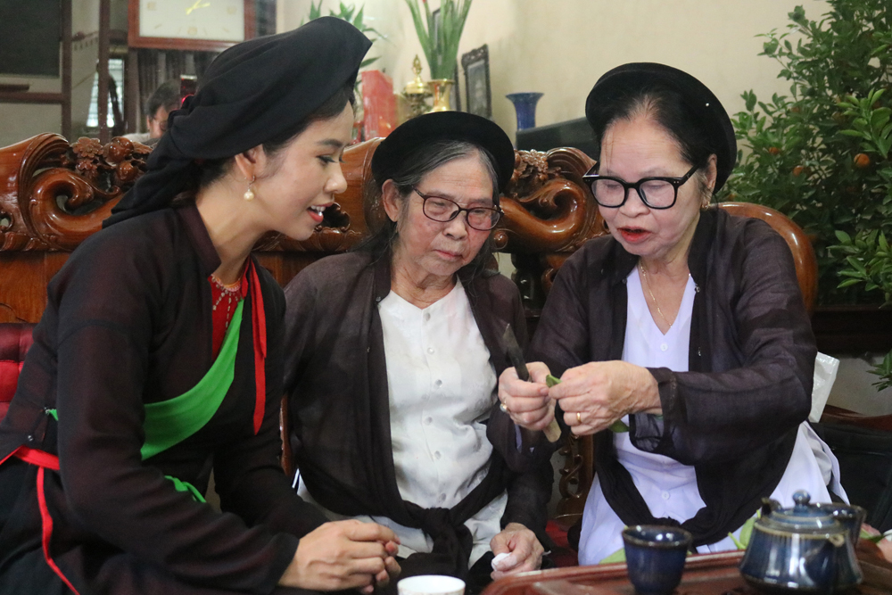 Wenn man von den beiden Künstlerinnen Nguyen Thi Sang und Nguyen Thi Them aus dem Dorf Diem spricht, weiß fast jeder Quan-Ho-Liebhaber, dass sie Schwestern aus einer Familie traditioneller Quan-Ho-Sängerinnen sind. Die Schwestern Sang-Them, die Hunderte von alten Liedern von ihrer Mutter geerbt haben, sind nicht nur für ihre unverwechselbaren, klangvollen und ausdrucksstarken Stimmen bekannt, sondern auch für ihre Bescheidenheit, ihre akribische Handwerkskunst und ihr tiefes Verständnis der Quan-Ho-Kultur. Seit vielen Jahren widmen die beiden Künstlerinnen ihre Zeit und ihr Geld dem Sammeln und Bewahren von Dokumenten und Artefakten des traditionellen Quan Ho und gründeten die Sang-Them Quan Ho Bibliothek, um diese aufzubewahren, auszustellen und Besuchern aus nah und fern zugänglich zu machen. Die Volkskünstlerin Nguyen Thi Them erzählt: „Ausgehend von den Trachten, die unsere Mutter hinterlassen hat, entstand bei meiner Schwester und mir die Idee, Artefakte vergangener Generationen zu sammeln und zu bewahren, um zukünftigen Generationen das wahre Wesen des Quan-Ho-Gesangs näherzubringen.“ In den letzten Jahren hat sich die Sang-Them Quan Ho Bibliothek zu einem beliebten Ziel für Kulturerbe-Liebhaber entwickelt.