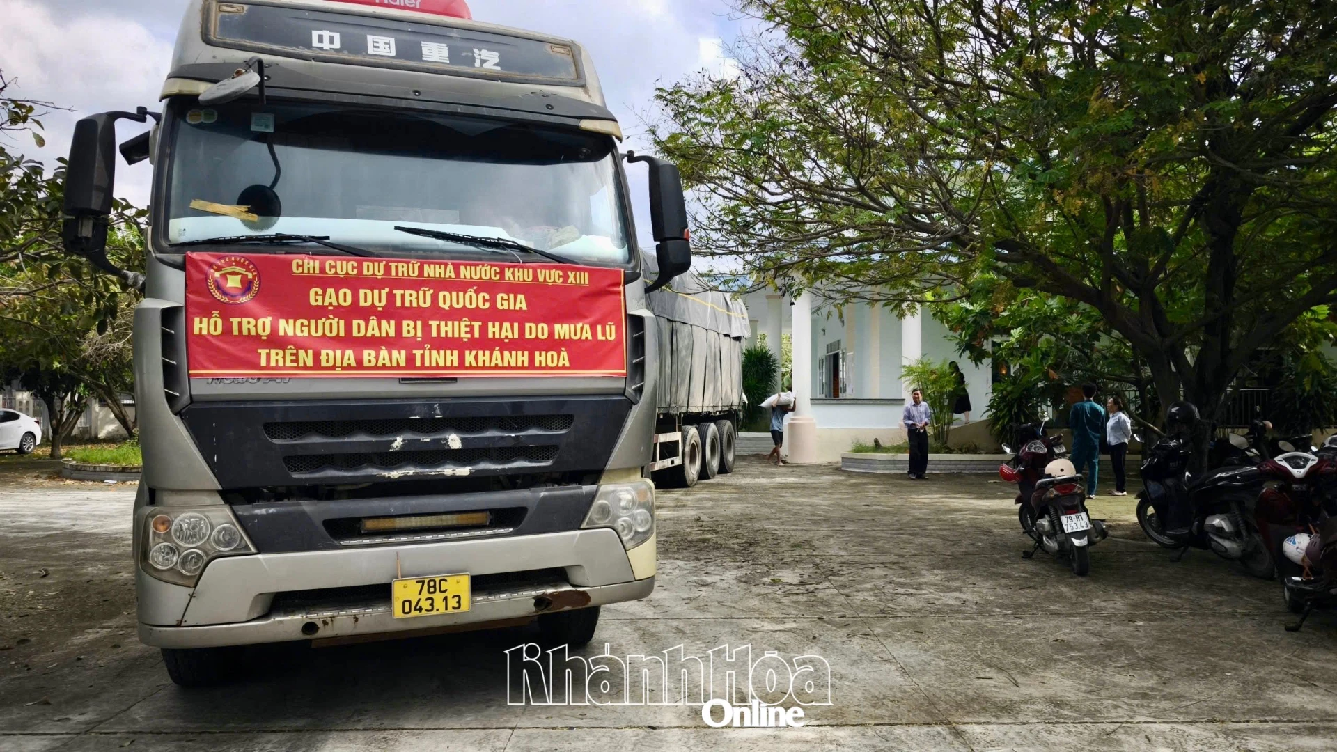 | Fahrzeuge transportieren Reis aus der nationalen Reserve in Gemeinden und Stadtteile der Provinz Khanh Hoa . |