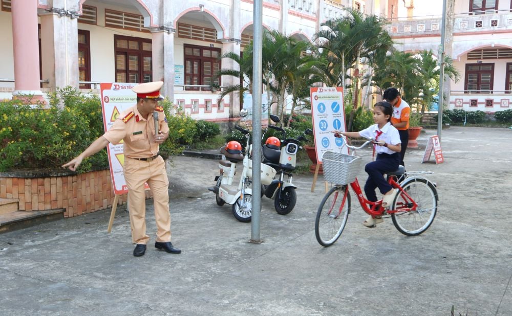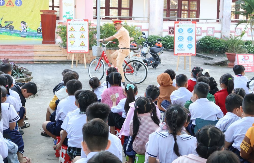 Lehrer und Schüler der Schule wurden von Beamten der Verkehrspolizei der Provinzpolizei Dong Thap über Verkehrssicherheit und -ordnung informiert; gleichzeitig wurden sie in grundlegenden Fähigkeiten für die Teilnahme am Straßenverkehr unterwiesen, wie zum Beispiel: Sicherheitsregeln für das Gehen auf dem Gehweg, die Wirkung von Helmen; das richtige Tragen von Helmen beim Fahren von Motorrädern, Rollern und Elektrofahrrädern; das Fahren in der richtigen Fahrspur, das Beachten von Ampeln; das Verbot, auf der Straße zu spielen oder zu rennen, und das Verbot, sich vor dem Schultor zu versammeln.