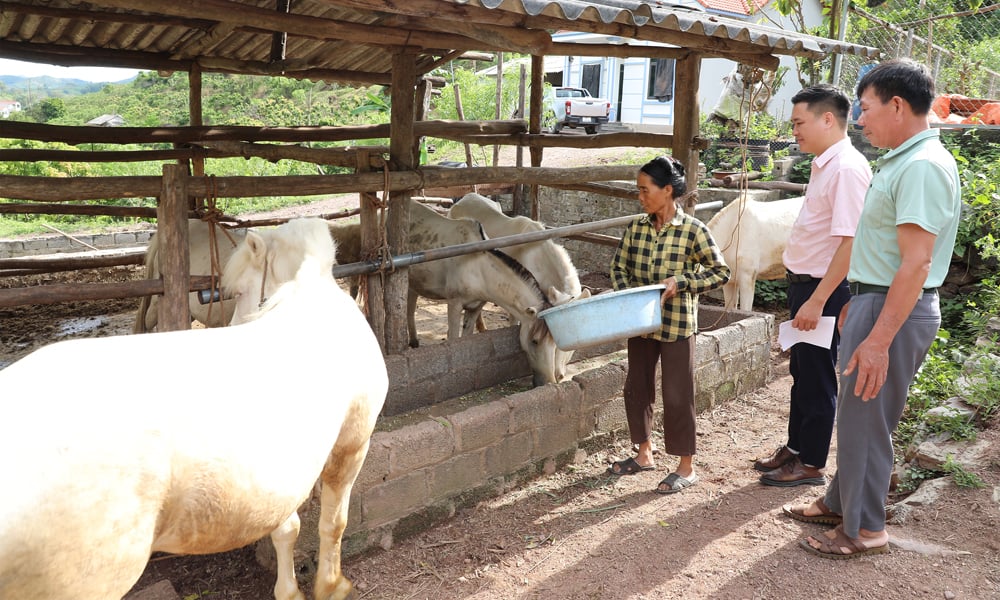 Herr Vi Van Dao (Jahrgang 1990), Angehöriger der Ethnie Nung, Dorf Cha, Gemeinde Bien Son, hat vier schulpflichtige Kinder. Seine Familie hat sechs Mäuler zu ernähren und lebt nur von über 100 Litschibäumen und einigen Kim-Pferden (eine einheimische weißhaarige Pferderasse). Je älter die Kinder werden, desto höher werden die Ausgaben für das Familienleben, während das Einkommen begrenzt ist. Daher wird Herrn Daos Familie vor 2025 als armer Haushalt eingestuft. Nach einem Vergleich und einer Prüfung durch die lokalen Behörden wurden Herr Dao und seine Frau im Juli 2023 von der Spar- und Kreditgruppe des Bauernverbands des Dorfes Cha kontaktiert, um 100 Millionen VND von der bevorzugten Kapitalquelle zu leihen, um Produktion und Geschäft zu unterstützen und das Leben des Transaktionsbüros der Luc Ngan Social Policy Bank zu verbessern. Mit dem Kapital kaufte das Paar zwei weitere weiße Zuchtsauen zur Aufzucht (neben dem Fleisch sind die Knochen von weißen Pferden wertvoller als die von Kim-Pferden). Das restliche Geld wird für den Kauf von Tierfutter zur Versorgung der Pferdeherde verwendet. Dank guter Pflege haben bisher zwei Sauen fünf Fohlen geboren, er hat vier Fohlen verkauft und damit 60 Millionen VND verdient. Laut Genossin Nguyen Thi Nam, Sekretärin des Parteikomitees der Kommune Bien Son, hat die Kommune derzeit mehr als 11.900 Tiere, davon allein mehr als 2.900 Pferde (und damit 150 % des Plans für den Zeitraum 2020–2025). In Bien Son haben Hunderte von Haushalten wie der Haushalt von Herrn Dao Produktionskredite erhalten, und die meisten haben dieses Kapital zum Aufbau ihrer Pferdeherde verwendet. Alle Haushalte haben das Kreditkapital gut genutzt, viele sind der Armut oder der Armutsgrenze entkommen. Die Pferdezucht hat zur Bekämpfung des Hungers und zur Armutsminderung in der Region beigetragen. Derzeit haben sich Pferdezuchthaushalte in der Gemeinde mit der Phong Van Agricultural - Forestry Cooperative zusammengeschlossen, um das berühmte 3-Sterne-OCOP-Produkt „Phong Van Horse Glue“ herzustellen und zu warten.