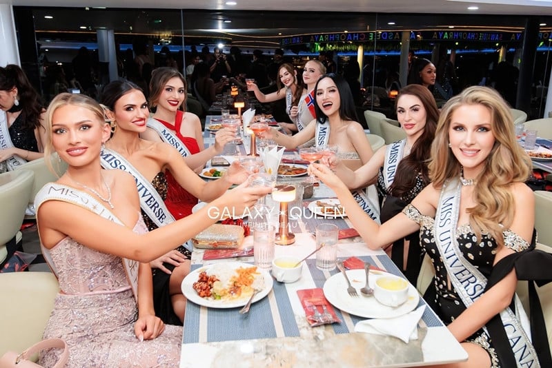 Auf der Yacht saß Huong Giang mit Teilnehmerinnen aus vielen verschiedenen Kontinenten an einem Tisch. Um ihre Wettbewerbsfotos abwechslungsreicher zu gestalten, wechselte Huong Giang innerhalb eines Tages drei Kleider.