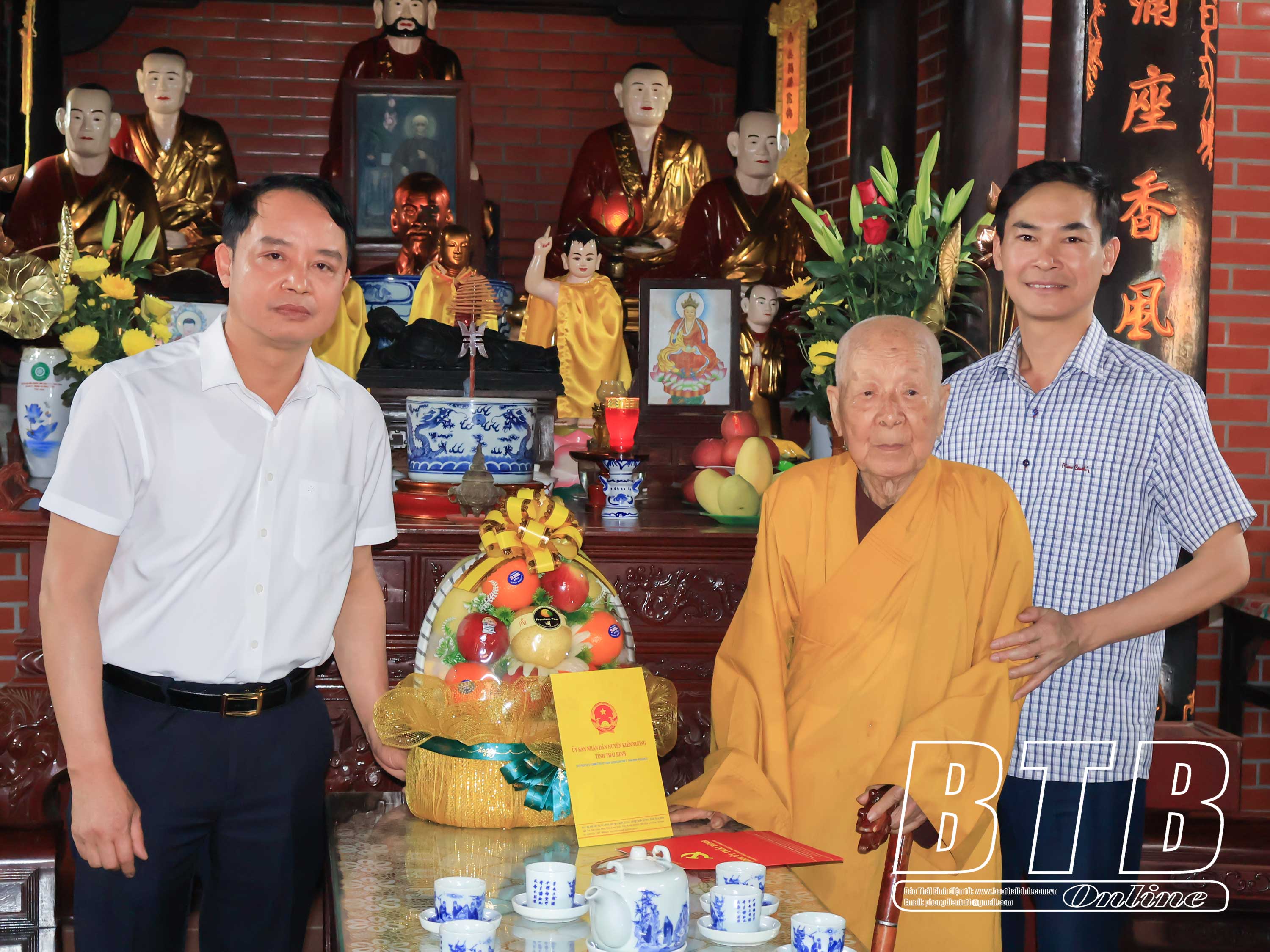 Đồng chí Nguyễn Tiến Thành, Phó Bí thư thường trực Tỉnh ủy, Chủ tịch HĐND tỉnh và đồng chí Lại Văn Hoàn, Tỉnh ủy viên, Phó Chủ tịch UBND tỉnh tặng hoa chúc mừng Thượng toạ Thích Thanh Vượng, Phó trưởng Ban thường trực Ban Trị sự Giáo hội Phật giáo Việt Nam tỉnh, trụ trì chùa Quan Âm, thị trấn Kiến Xương.