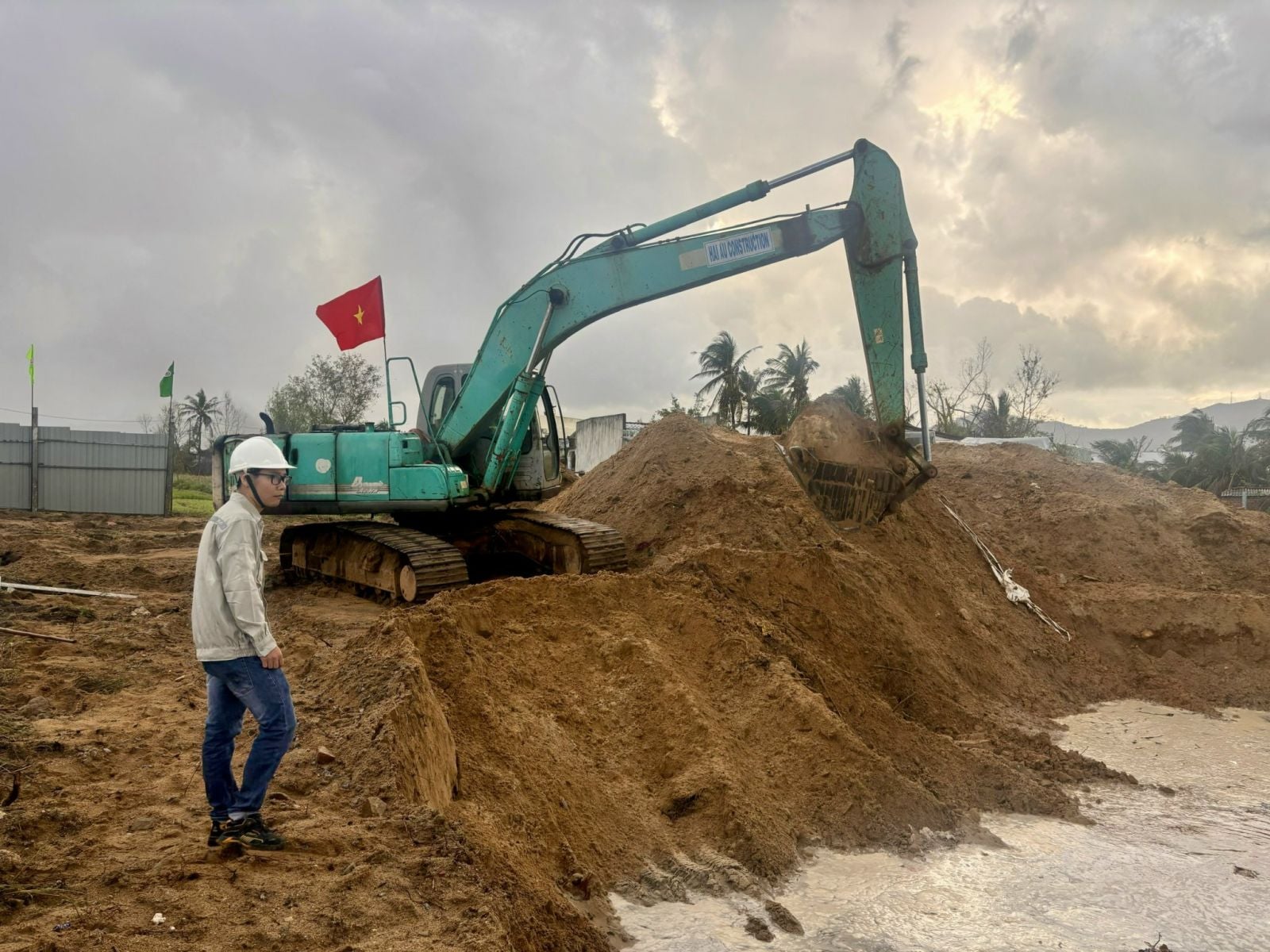 Η κατασκευαστική μονάδα έχει συγκεντρώσει υλικά και κατασκευάζει τα θεμέλια στο έργο περιοχής επανεγκατάστασης στο χωριό An Quang Dong, στην κοινότητα De Gi.